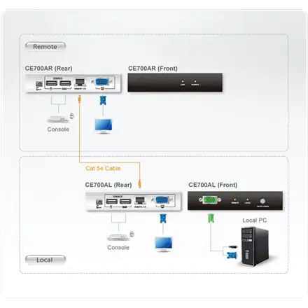 Cat 5e cable connects the Local and Remote Units - up to 150m apart. Dual console operation - control your system from both the local and remote USB keyboard, monitor, and mouse consoles. High resolution video - up to 1920 x 1200@60Hz (30m ); 1600 x 1200@60Hz (100m); 1280 x 1024@60Hz (150m). Automatic gain control - adjusts signal strength to compensate for distance. CE700AL- Console Ports: 2 x USB Type A Female (White) 1 x HDB-15 Female (Blue) KVM Ports:1 x SPHD-17 Female (Green); Unit To Unit: 1 x RJ-45 Female (Black) Power:1 x DC Jack (Black). CE700AR- Console Ports: 2 x USB Type A Female (White) 1 x HDB-15 Female (Blue); Unit To Unit: 1 x RJ-45 Female (Black); Power: 1 x DC Jack (Black).