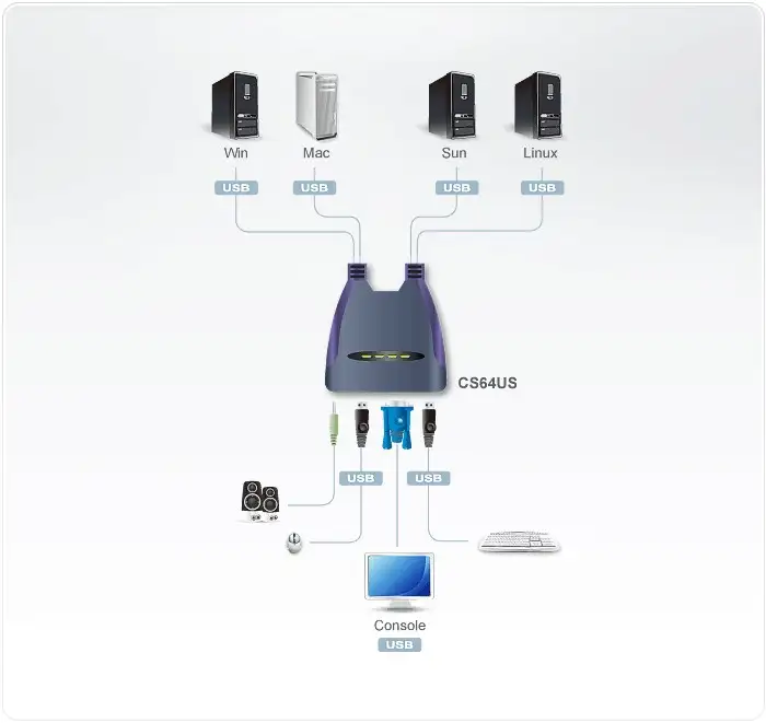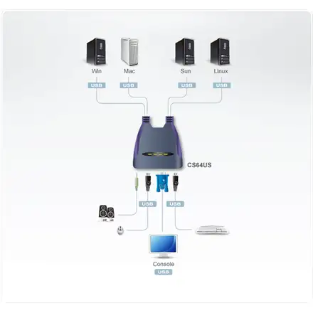 Superior video quality – up to 2048 x 1536; DDC2B Computer Selection via hotkey Multiplatform support - Windows, Linux, Mac, Sun Built-in 0.9/1.2 m cables and bus-powered design. Computer Connections - 4. Console Ports: 1 x HDB-15 Female (Blue); 2 x USB Type A Female; 1 x 3.5mm Audio Jack Female (Green); KVM Ports:4 x HDB-15 Male (Blue); 4 x USB Type A Male; 4 x 3.5mm Audio Jack Female (Green).