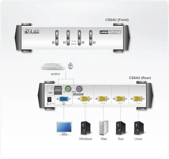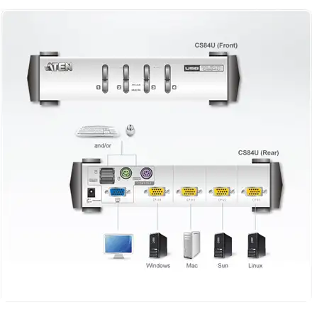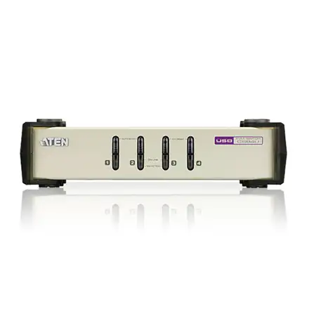 Superior video quality - 2048 x 1536; DDC2B. Computer selection via front panel pushbuttons, hotkeys, and mouse. Dual Interface - supports computers with PS/2 or USB keyboards and mice. Video DynaSync™ - Exclusive ATEN technology eliminates bootup display problems and optimizes resolution when switching between ports. Console Ports- 1 x HDB-15 Female (Blue),2 x USB Type A Female,1 x 6-pin Mini-DIN Female (Purple),1 x 6-pin Mini-DIN Female (Green). KVM Ports-4 x SPHD-18 Female (Yellow). Power-1 x DC Jack