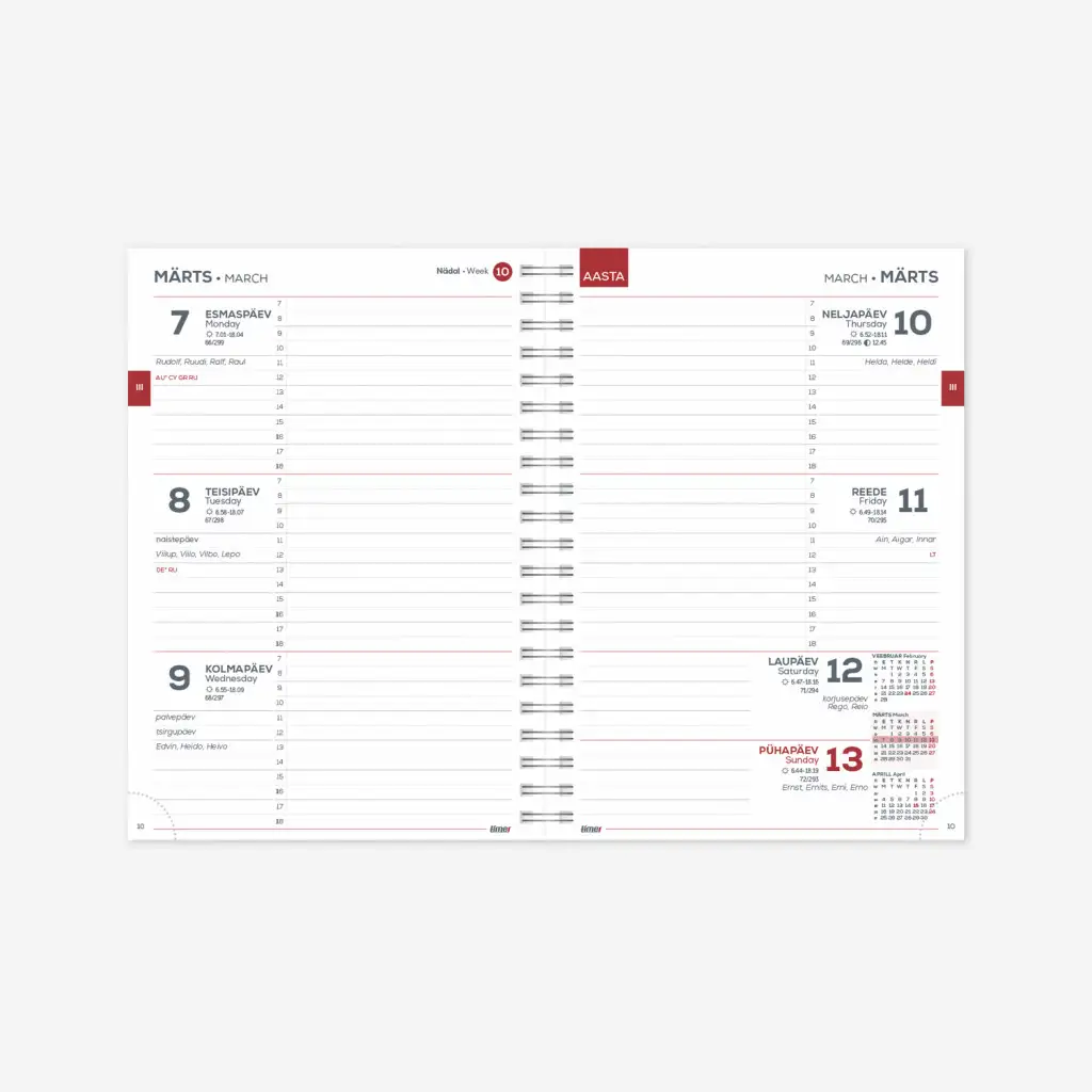 Leht on terveks nädalaks (Nädal H), perforeeritud lehenurgadriigipühad, riiklikud ja rahvakalendri tähtpäevad, lipu- ja nimepäevad, 38 riigi riigipühad lühenditega, tõusu ja loojangu kellaajad (Tallinn), kuu faasid kellaaegadega, sodiaagimärkide algused, päevaloend, minikalender, nädala number, aastaaegade algused,kellaajad. Lisalehtedel aastaplaan (3 kuud lehel), puhkuse planeerija, linnadevahelised kaugused, kaugvalimiskoodid, maailma ajad,mõõtühikute teisendamine, tabelkalender, märkmelehed.