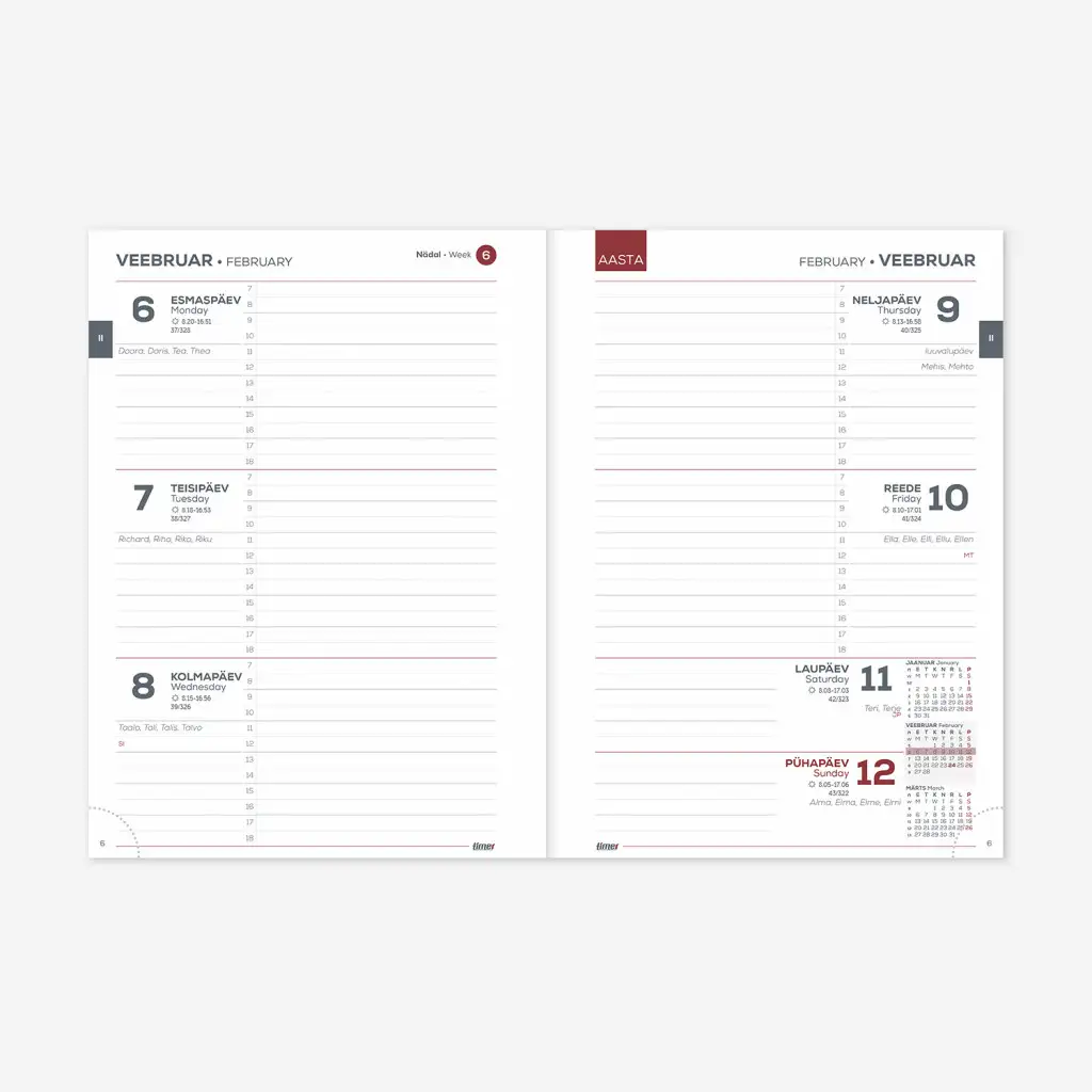 Leht on terveks nädalaks (Nädal H), perforeeritud lehenurgad, järjepaelriigipühad, riiklikud ja rahvakalendri tähtpäevad, lipu- ja nimepäevad, 38 riigi riigipühad lühenditega, tõusu ja loojangu kellaajad (Tallinn), kuu faasid kellaaegadega, sodiaagimärkide algused, päevaloend, minikalender, nädala number, aastaaegade algused,kellaajad. Lisalehtedel aastaplaan (3 kuud lehel), puhkuse planeerija, linnadevahelised kaugused, kaugvalimiskoodid, maailma ajad,mõõtühikute teisendamine, tabelkalender, märkmelehed.