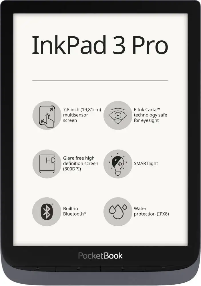 Model name InkPad 3 Pro|Screen size 7.8"|Touchscreen|Native resolution 1872x1404|CPU 1 GHz|Colour Grey|Dimensions 195 x 136.5 x 8 mm