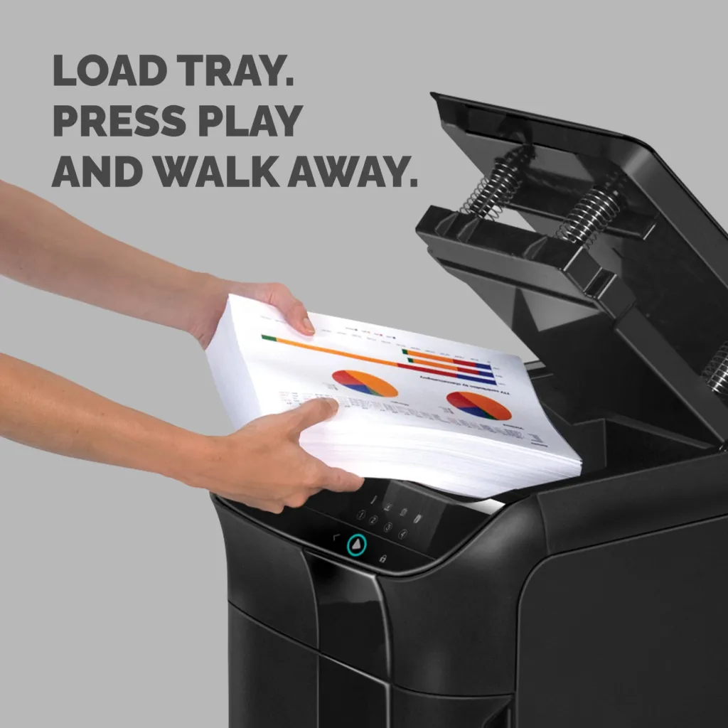 Fellowes AutoMax 600M. Purustamise tüüp: Micro-cut tüüpi purustaja, Töötamislaius: 23 cm, Purustamise suurus: 2 x 12 mm. Laius: 441 mm, Sügavus: 579 mm, Kõrgus: 890 mm. Päritoluriik: Hiina