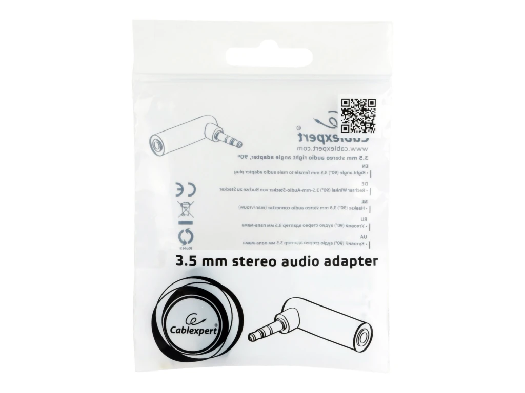 Right angle (90°) 3.5 mm female to male audio adapter plug; Minimizes cable bending; Gold plated contacts for excellent sound quality