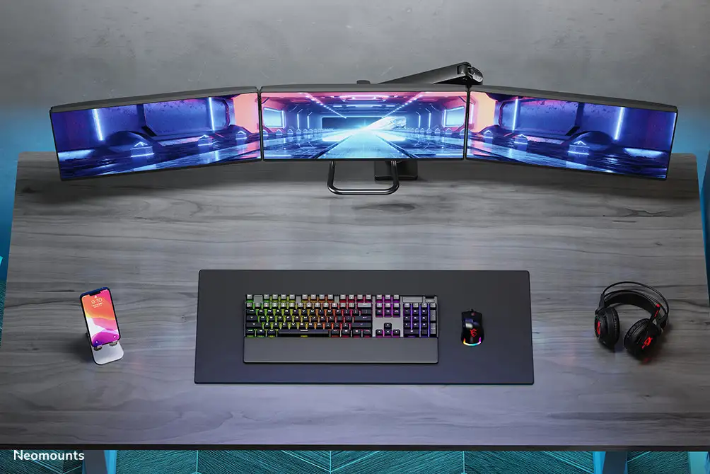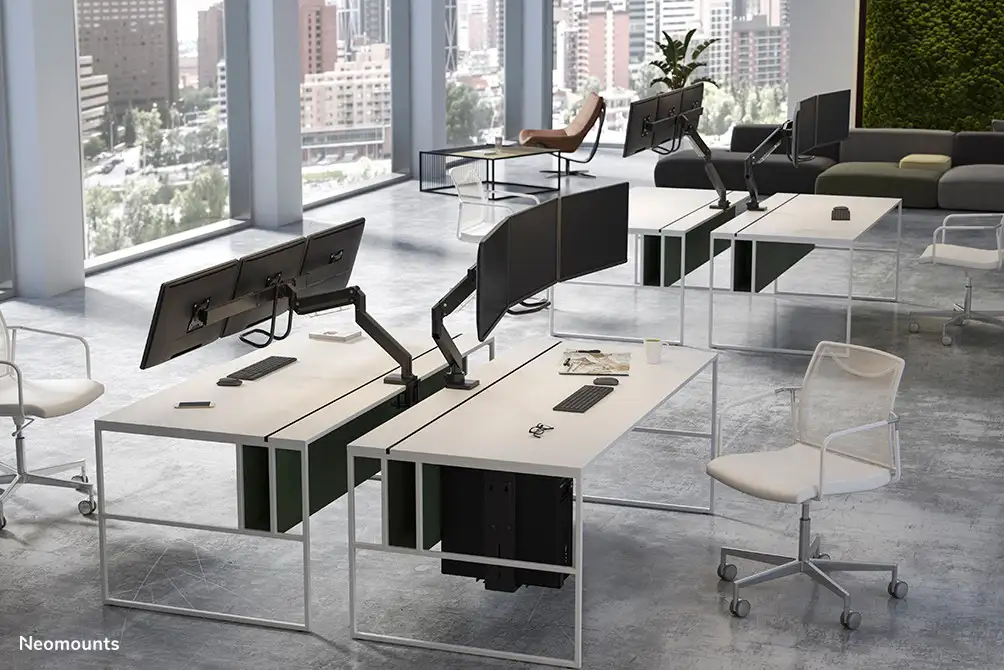 The Neomounts Select NM-D775DX3BLACK is a tilt-, swivel and rotatable desk mount with crossbar and handle for three flat screens up to 24". This mount is a great choice for space saving placement on desks using a desk clamp or grommet mount. Neomounts Selects unique tilt (20°), rotate (360°) and swivel (180°) technology allows the mount to change to any viewing angle to fully benefit from the capabilities of the flat screen. The mount is easily individually height adjustable to 60 centimetres using a gas spring. Depth adjustable from 0 to 63 centimetres. A unique cable management conceals and routes cables from mount to flat screen. Hide your cables to keep the workplace nice and tidy. The mount is equipped with a 180° stop mechanism. Neomounts Select NM-D775DX3BLACK with handle has three pivot points and is suitable for most screens up to 24" (61 cm). The weight capacity of this product is 2 to 18 kg (max. 6 kg each screen). The desk mount is suitable for screens that meet VESA hole pattern 75x75 or 100x100mm. Different hole patterns can be covered using Neomounts Select VESA adapter plates. By using an ergonomic mount neck- and back complaints can be avoided. Ideal for use in offices and on counters or in a reception area. All installation material is included with the product.