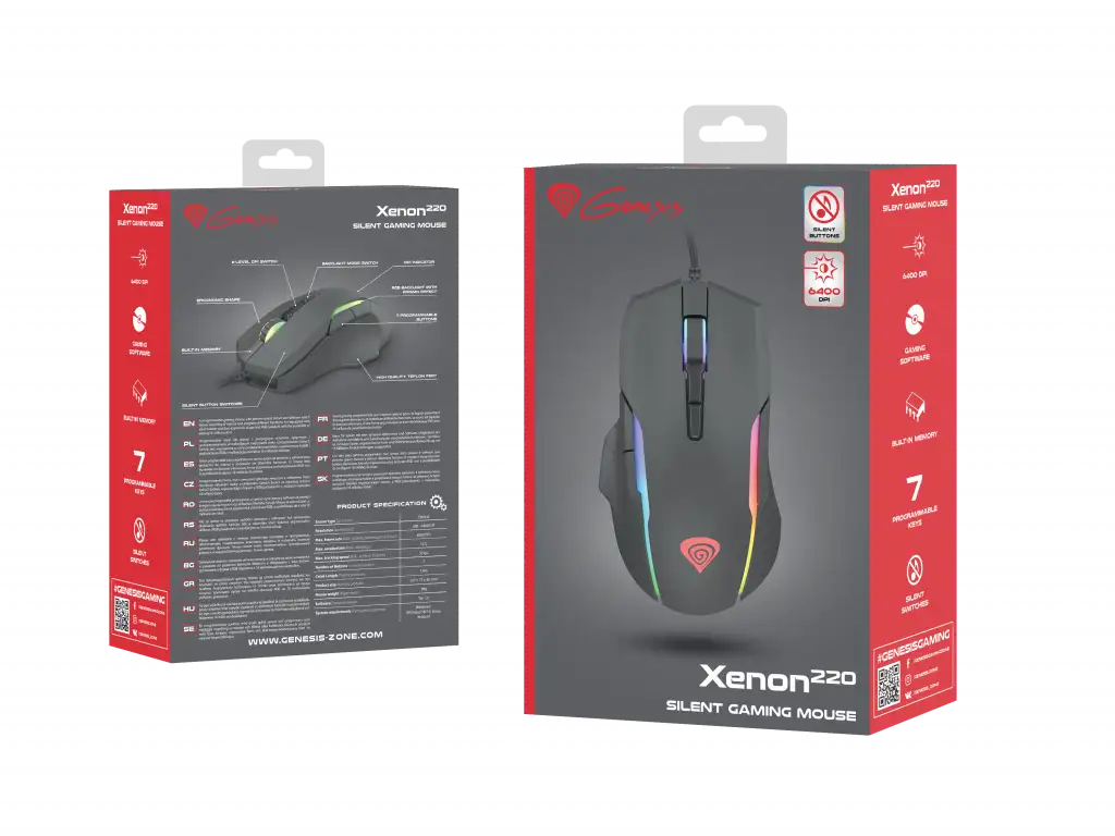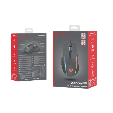 GENESIS Xenon 220 G2. Toote kuju: Mõlemakäeline. Liikumistuvastuse tehnoloogia: Optiline, Seadme liides: USB tüüp A, Liikumise resolutsioon: 12800 DPI, Kaadrisagedus: 7000 fps, Klahvide tüüp: Sissevajutatavad nupud, Nuppude arv: 7, Skrolli tüüp: Ratas, AC unified management & maintenance (Fit AP mode): 20 G. Valgustuse värv: Multi. Toiteallikas: Kaabel. Toote värv: Must