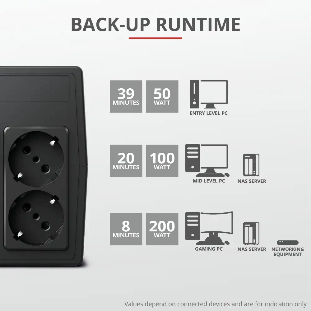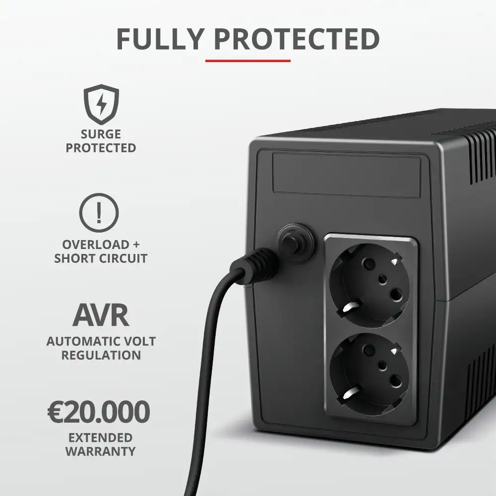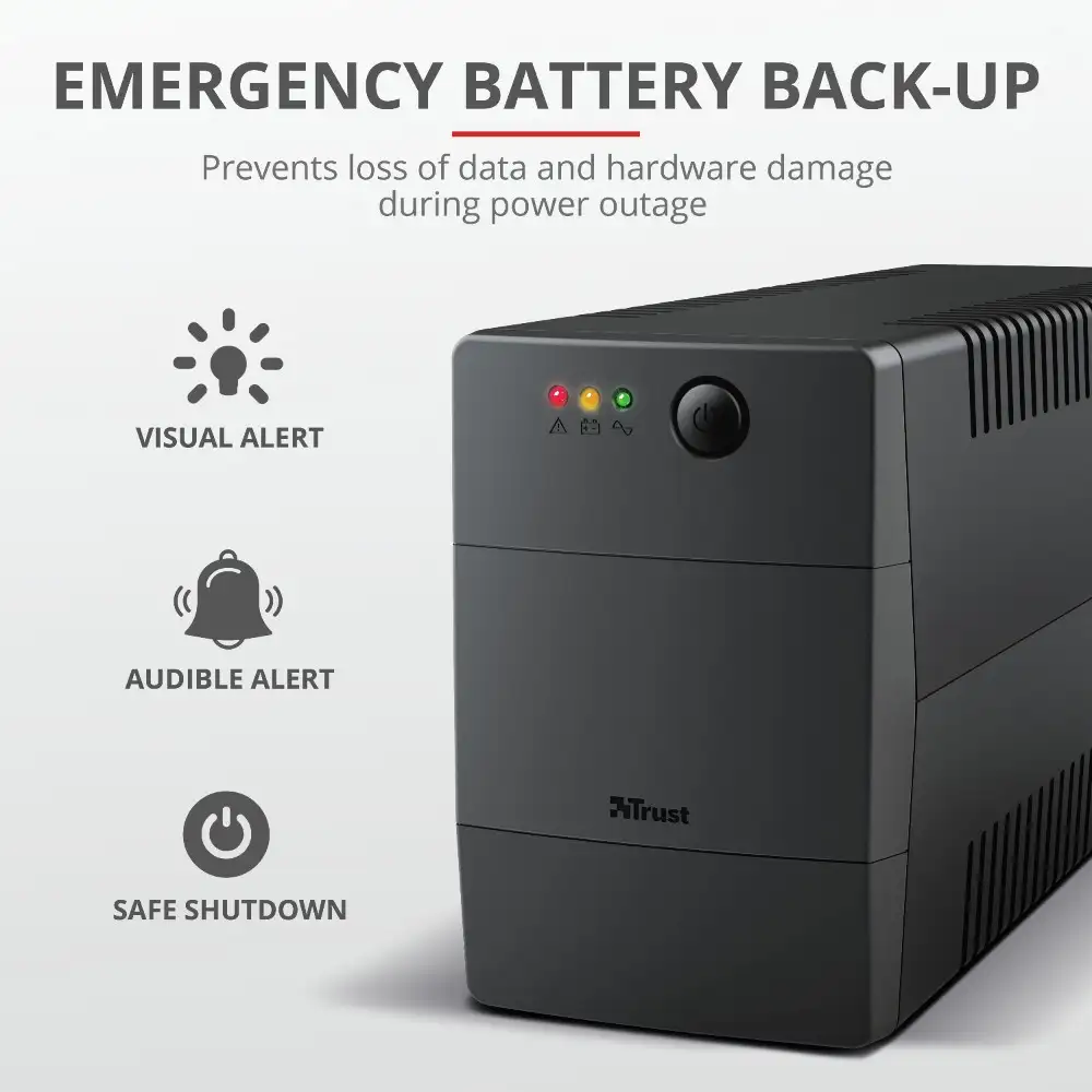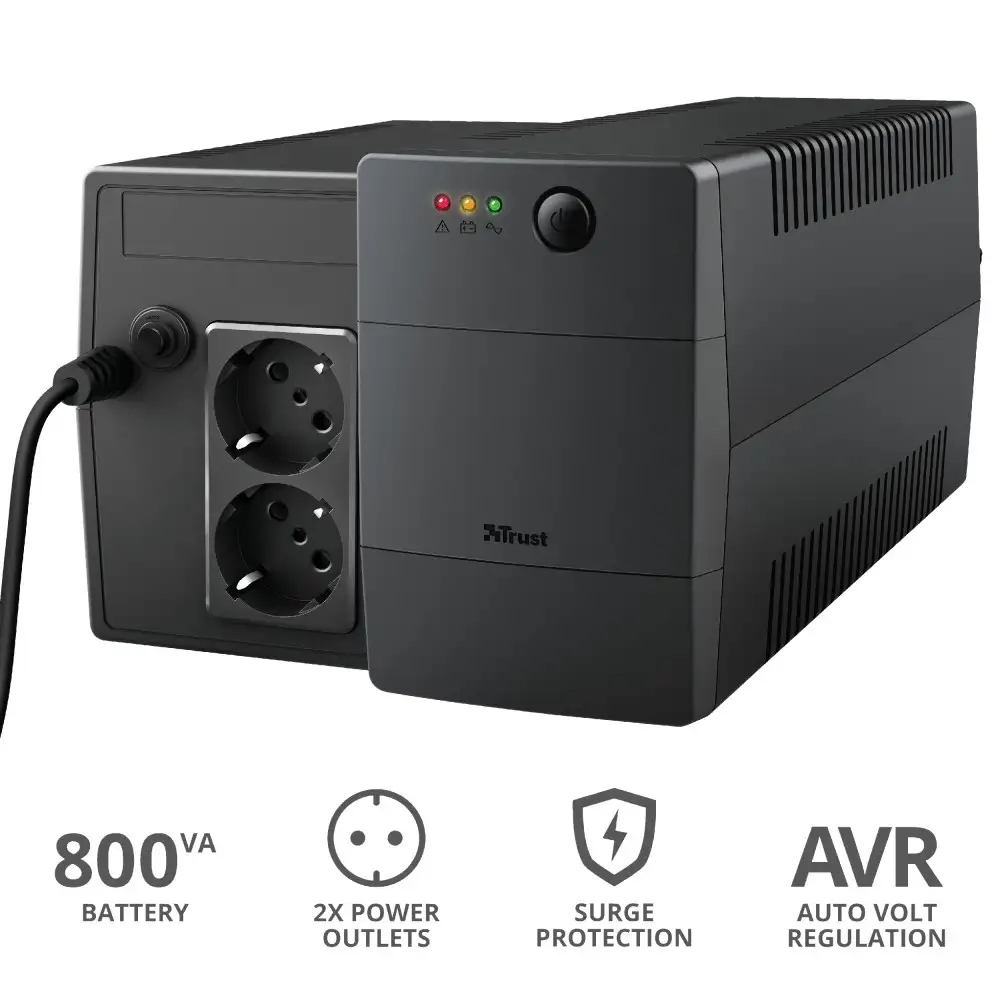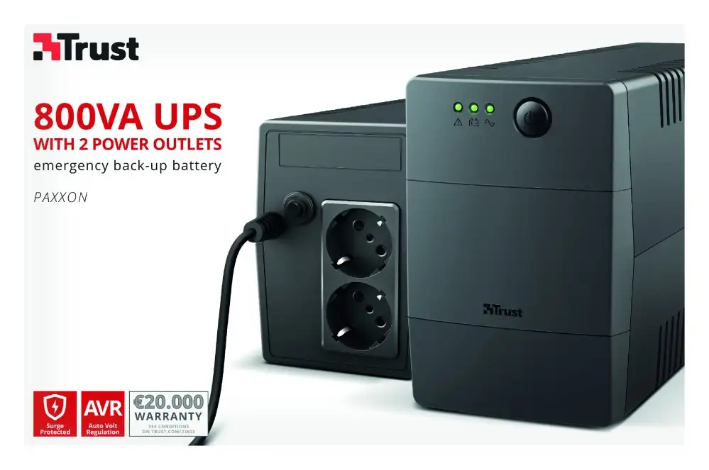 Tootja koduleht | www.trust.com/en/product/23503-paxxon-800va-ups-with-2-standard-wall-power-outlets |