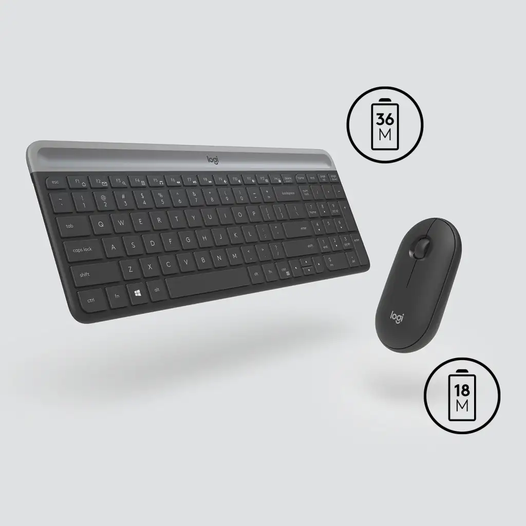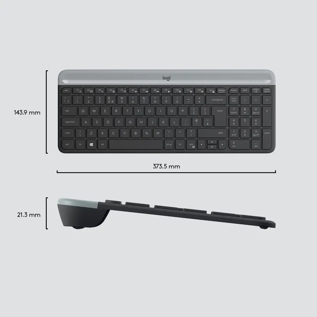 Logitech 920-009204. Klaviatuuri kujutegur: Täissuuruses (100%). Klaviatuuri stiil: Sirge. Ühenduvustehnoloogia: Juhtmevaba, Seadme liides: Raadioside, Klaviatuuri paigutus: QWERTY, Soovituslik kasutus: Universaalne. Toote värv: Grafiit. Hiir kaasa arvatud