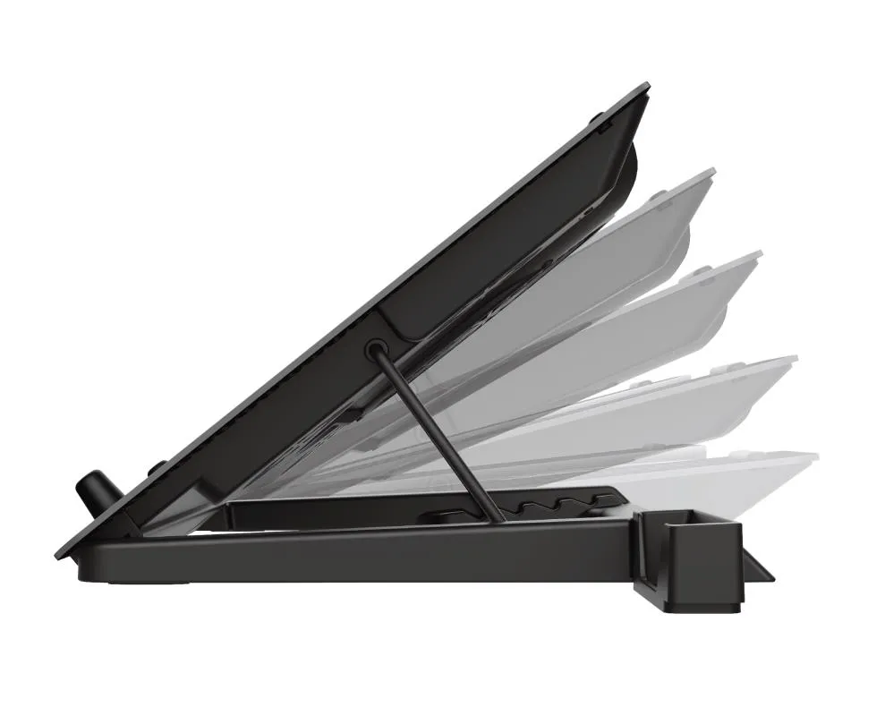 Trust GXT 1125 Quno. Toote tüüp: Sülearvuti alus, Toote värv: Must, Materjal: Alumiinium. Tõstekõrgus: 190 cm. Laius: 400 mm, Sügavus: 280 mm, Kõrgus: 50 mm
