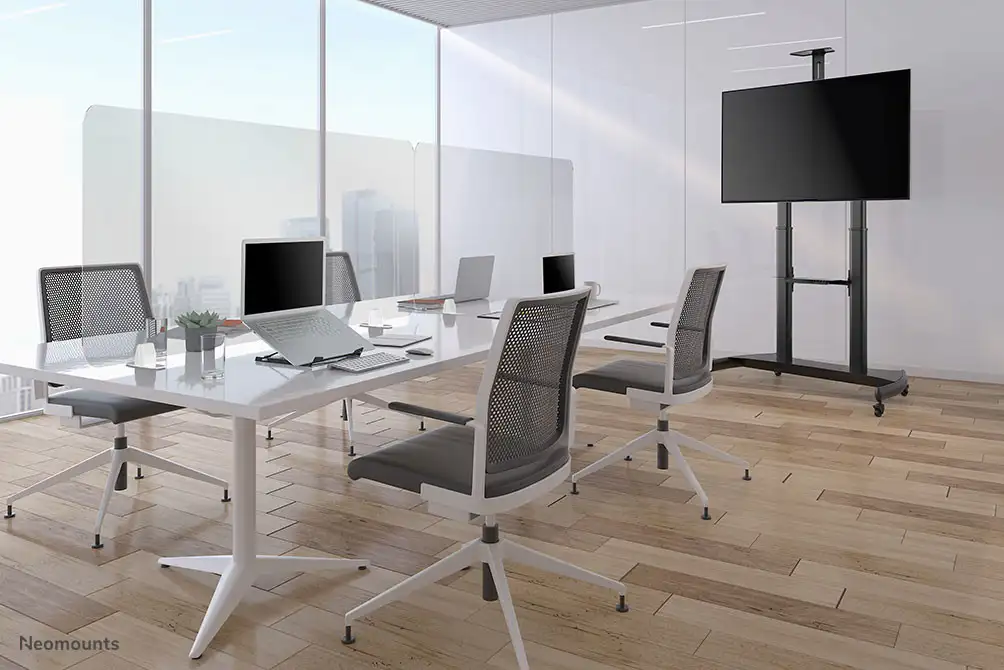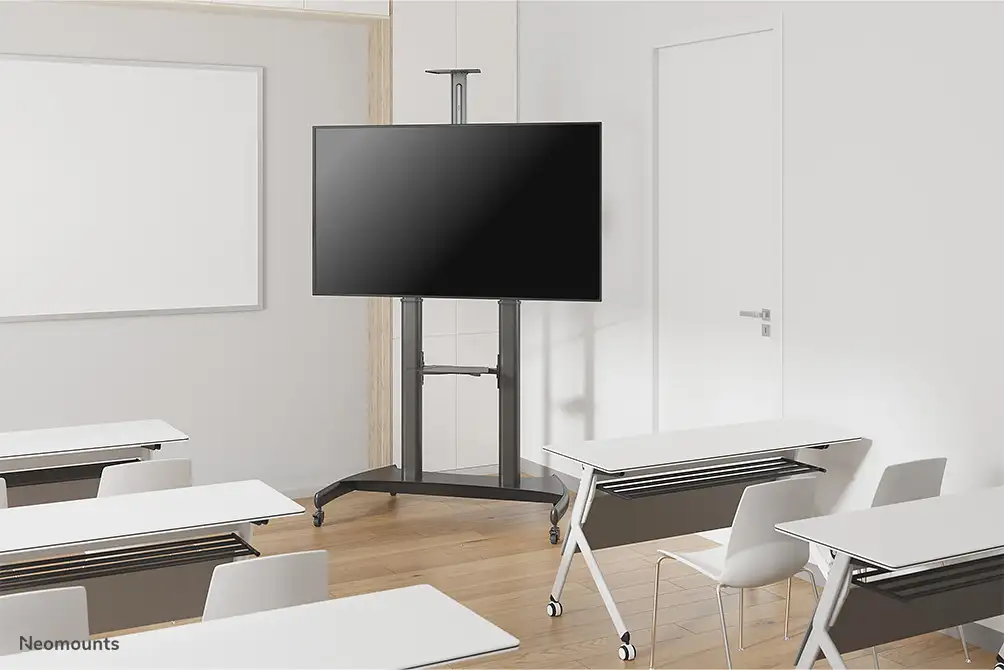 The Neomounts by Newstar floor stand, model PLASMA-M1950E is a mobile floor stand for flat screens up to 100" (254 cm). This mobile stand is a great choice for space saving placement or when wall-, ceiling mounting or desk placement is not an option. This cart stretches your investment by serving a variety of projection needs by sharing a large display over multiple rooms. Get optimal positioning for both standing and seated audiences, in any application, in any part of your location. Neomounts by Newstar's versatile tilt (15°) technology allows the mount to change to any viewing angle to fully benefit from the capabilities of the flat screen. The mount is manually height adjustable from 134 to 166 centimetres. An innovative cable management conceals and routes cables from mount to flat screen. Hide your cables to keep the stand nice and tidy. Neomounts by Newstars' floor stand, PLASMA-M1950E holds your TV, AV equipment and even hides your cables. The casters allow the stand to move it to where you need it. Easily roll this cart through doorways and over thresholds. Neomounts by Newstar PLASMA-M1950E is suitable for screens up to 100" (254 cm). The weight capacity of this product is 100 kg. The stand is suitable for screens that meet VESA hole pattern 400x400 to 1000x600mm. Different hole patterns can be covered using Neomounts by Newstar VESA adapter plates. Speedy assembly and installation. All installation material is included with the product.