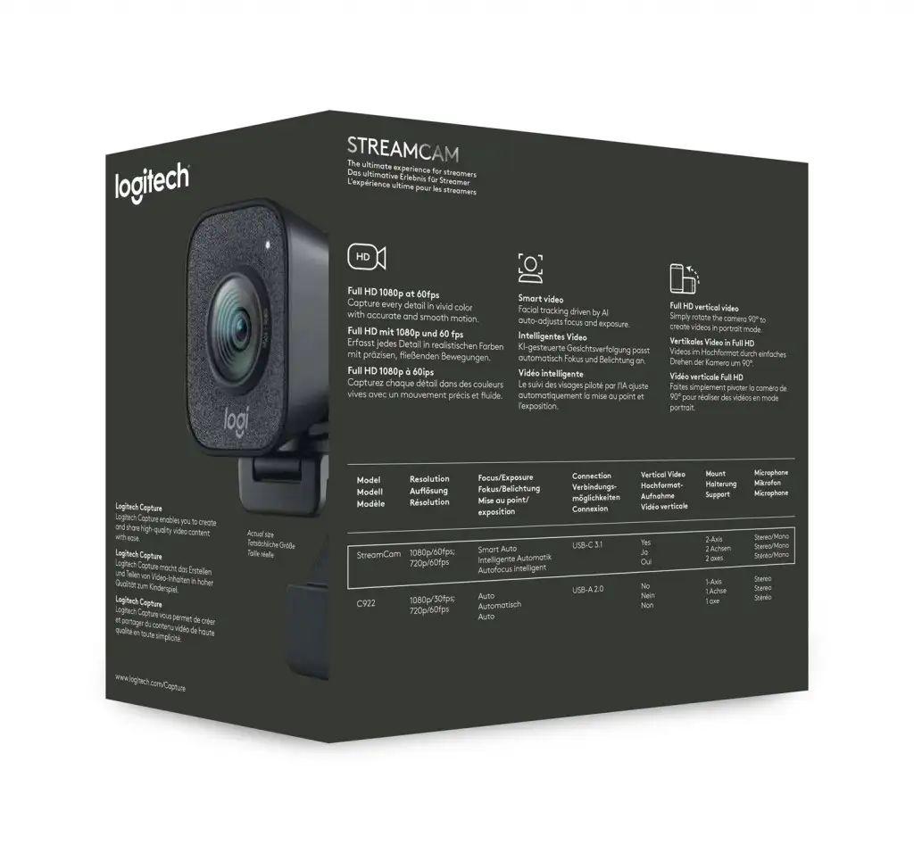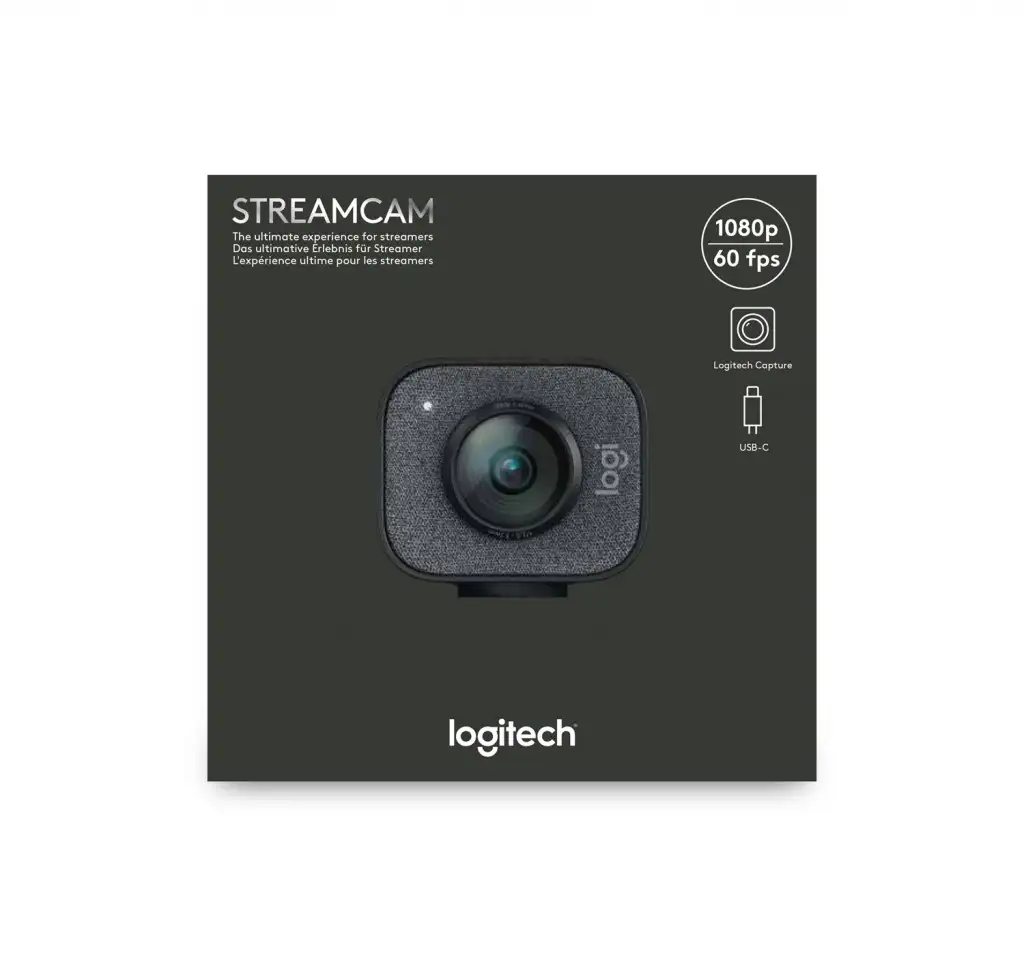 Logitech StreamСam. Maksimaalne video resolutsioon: 1920 x 1080 pikslit, Kaamera HD tüüp: Full HD, Maksimaalne kaadrisagedus: 60 fps. Liides: USB 3.2 Gen 1 (3.1 Gen 1), Toote värv: Grafiit, Kinnituse tüüp: Klamber/statiiv. Toetatud Windowsi operatsioonisüsteemid: Windows 10, Windows 11, Toetatud Maci operatsioonisüsteemid: Mac OS X 10.14 Mojave, Mac OS X 10.15 Catalina, Mac OS X 10.15.3 Catalina, Mac OS X 11.0 Big Sur,.... Laius: 58 mm, Sügavus: 85 mm, Kõrgus: 66 mm. Pakendi tüüp: Karp, Pakendi laius: 80 mm, Pakendi sügavus: 136 mm