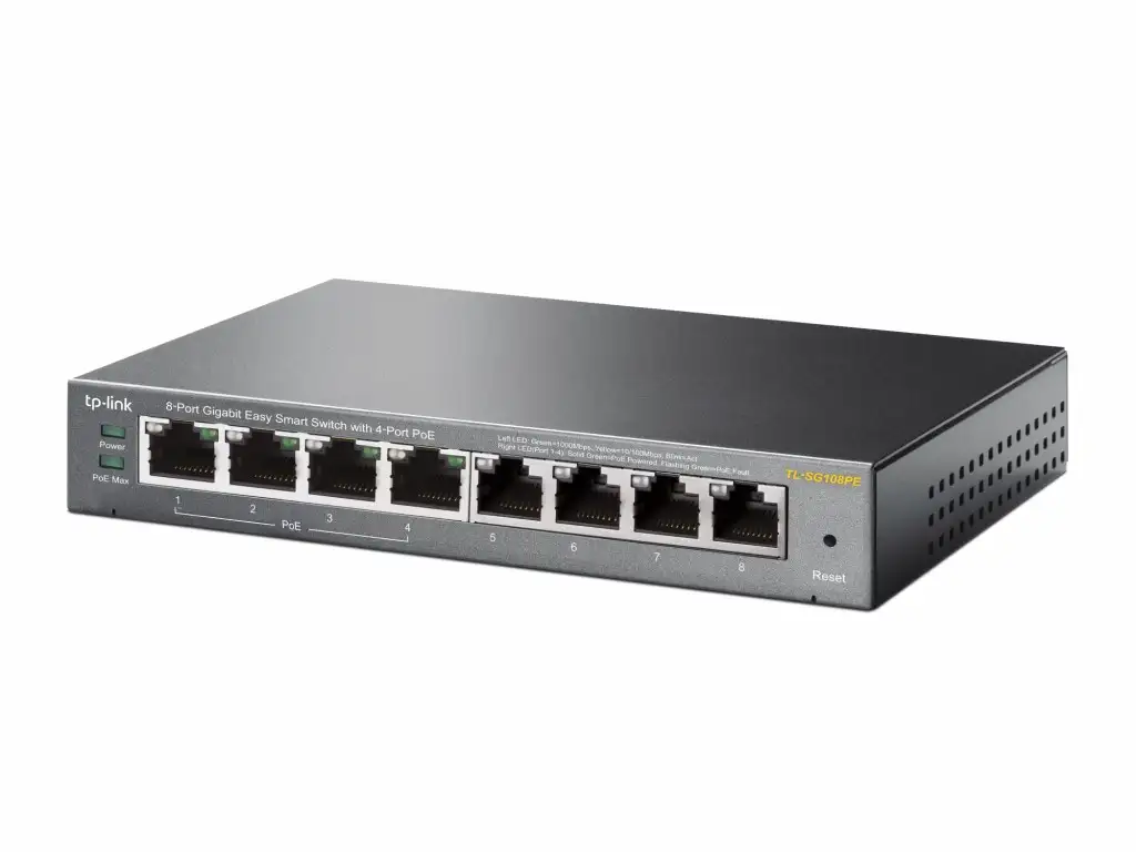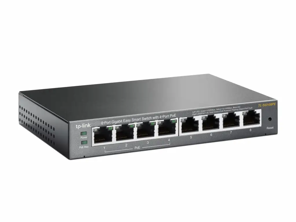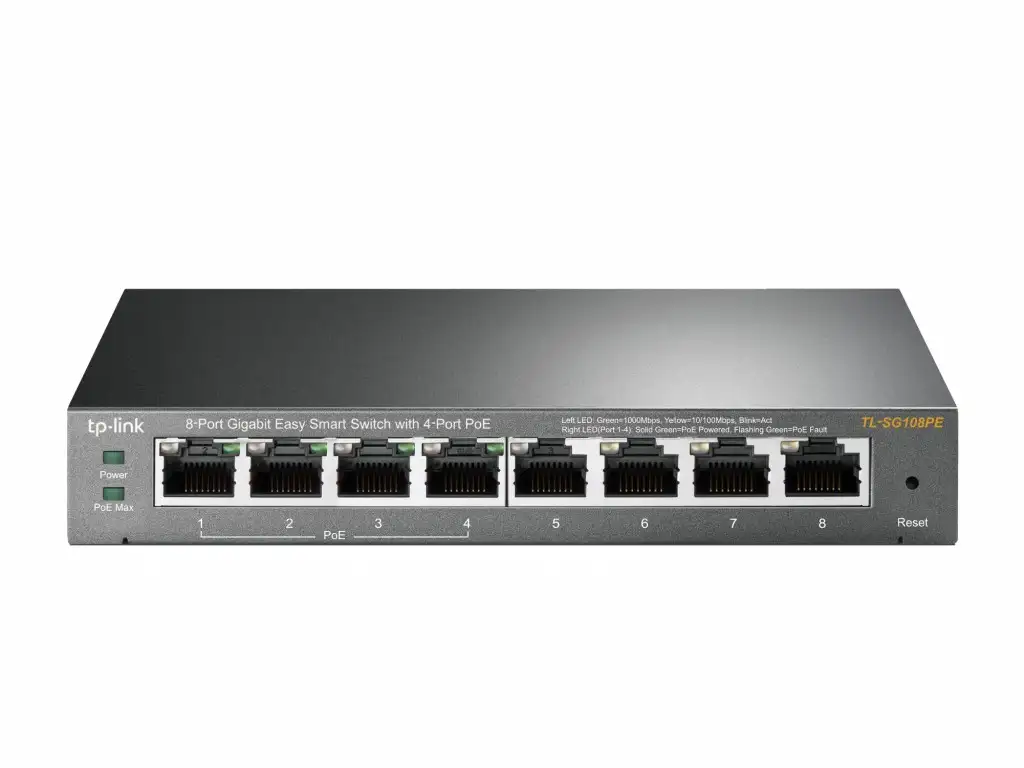 TP-Link TL-SG108PE. Lüliti tüüp: Juhitav, Lüliti kiht: L2. RJ-45 Etherneti ühenduse pesade tüüp: Gigabit Ethernet (10/100/1000), RJ-45 Etherneti ühenduse pesade arv: 8. MAC-aadresside tabel: 4000 sisestust, Lülitusvõime: 16 Gbit/s. Võrgustandardid: IEEE 802.1Q, IEEE 802.1p, IEEE 802.3ab, IEEE 802.3i, IEEE 802.3u, IEEE 802.3x. Power over Ethernet tugi