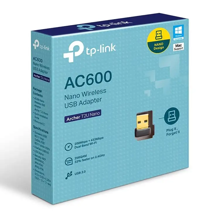 TP-Link Archer T2U Nano. Ühenduvustehnoloogia: Juhtmega ühendatud, Hostiliides: USB, Liides: WLAN. Andmete edastamise maksimaalne määr: 433 Mbit/s, Wi-Fi standard: Wi-Fi 5 (802.11ac), Wi-Fi laineala: Kaks sagedusala (2,4 GHz / 5 GHz). Toide USB kaudu. Toote värv: Must