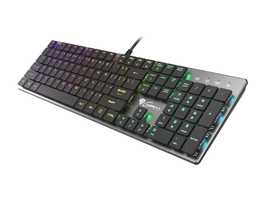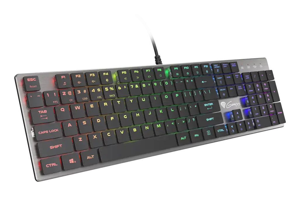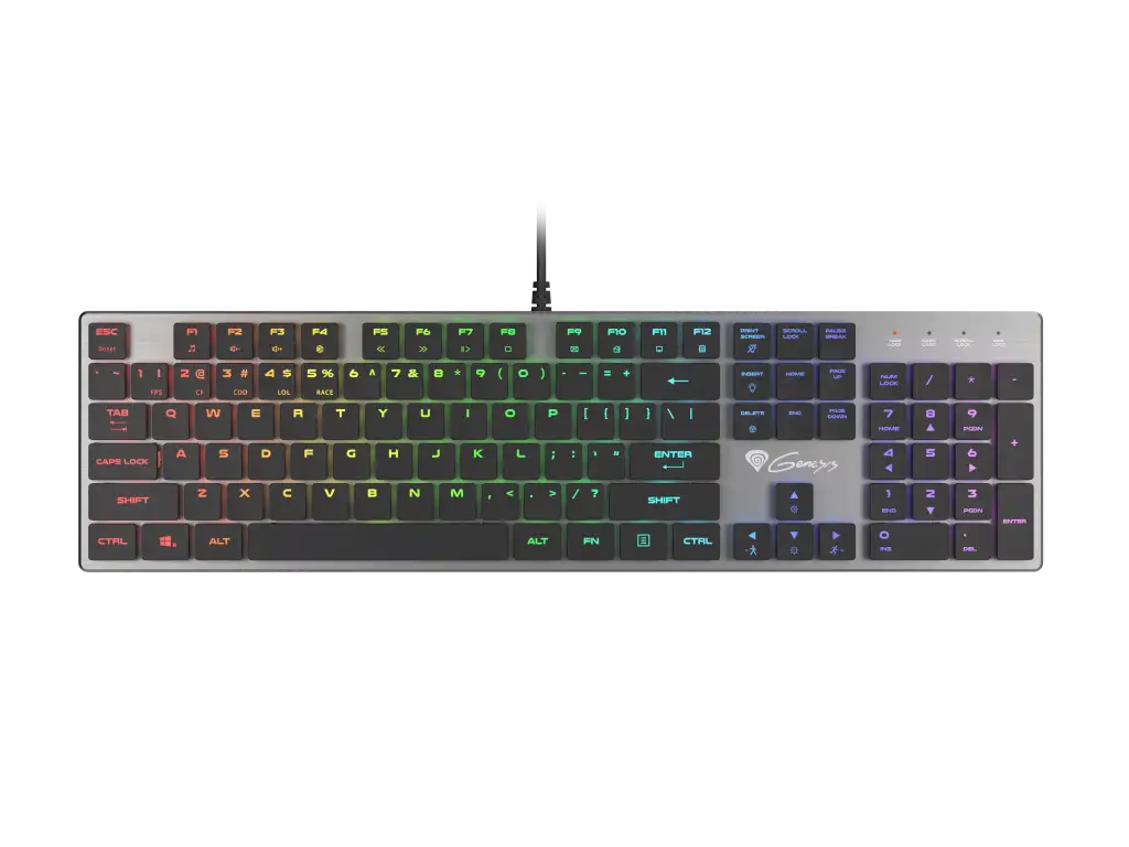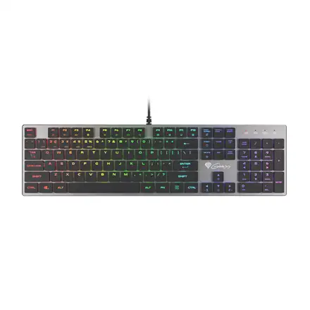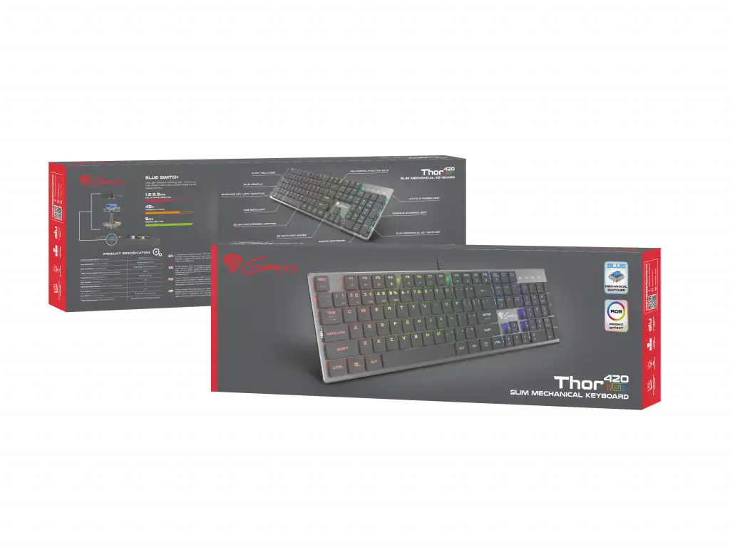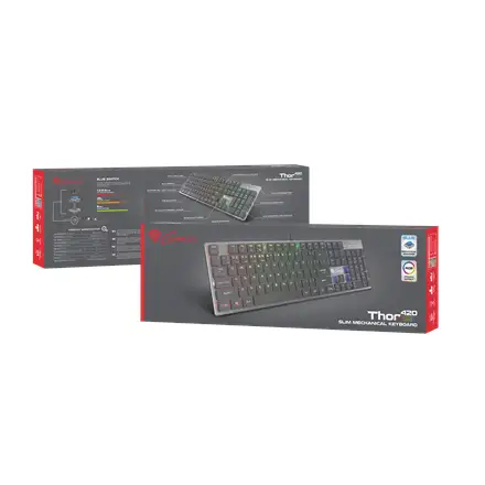 GENESIS Thor 420 RGB. Klaviatuuri kujutegur: Täissuuruses (100%). Klaviatuuri stiil: Sirge. Ühenduvustehnoloogia: Juhtmega ühendatud, Seadme liides: USB, Klaviatuuri klahvilüliti: Mehaaniline klahvlüliti, Klaviatuuri paigutus: QWERTY, Klaviatuuri klahvide arv: 104. Tagantvalgustuse tüüp: RGB LED. Kaabli pikkus: 1,65 m. Soovituslik kasutus: Mängimine. Toote värv: Hõbe