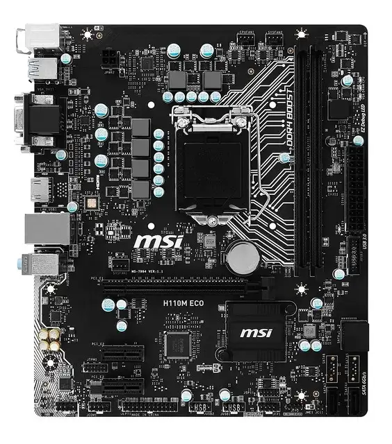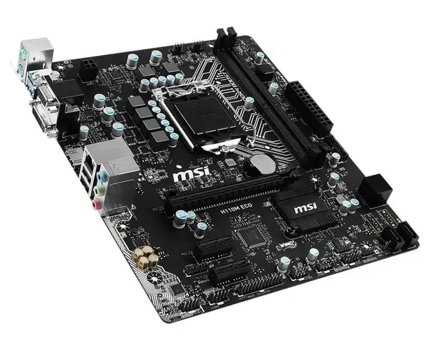 MSI H110M ECO. Toetatud mälutüübid: DDR4-SDRAM, Mälupesa tüüp: DIMM, Toetatud mälu taktsagedused: 2133 MHz. Protsessori tootja: Intel, Ühilduvad protsessoriseeriad: Intel® Celeron®, Intel® Pentium®, Protsessori pesa: LGA 1151 (pesa H4). Kõvaketta ühenduse tüüp: Jada ATA III. Ethernet-liidese tüüp: Kiire Ethernet, Gigabit Ethernet. Komponent: PC, Emaplaadi kiibistik: Intel, Emaplaadi kiip: Intel® H110