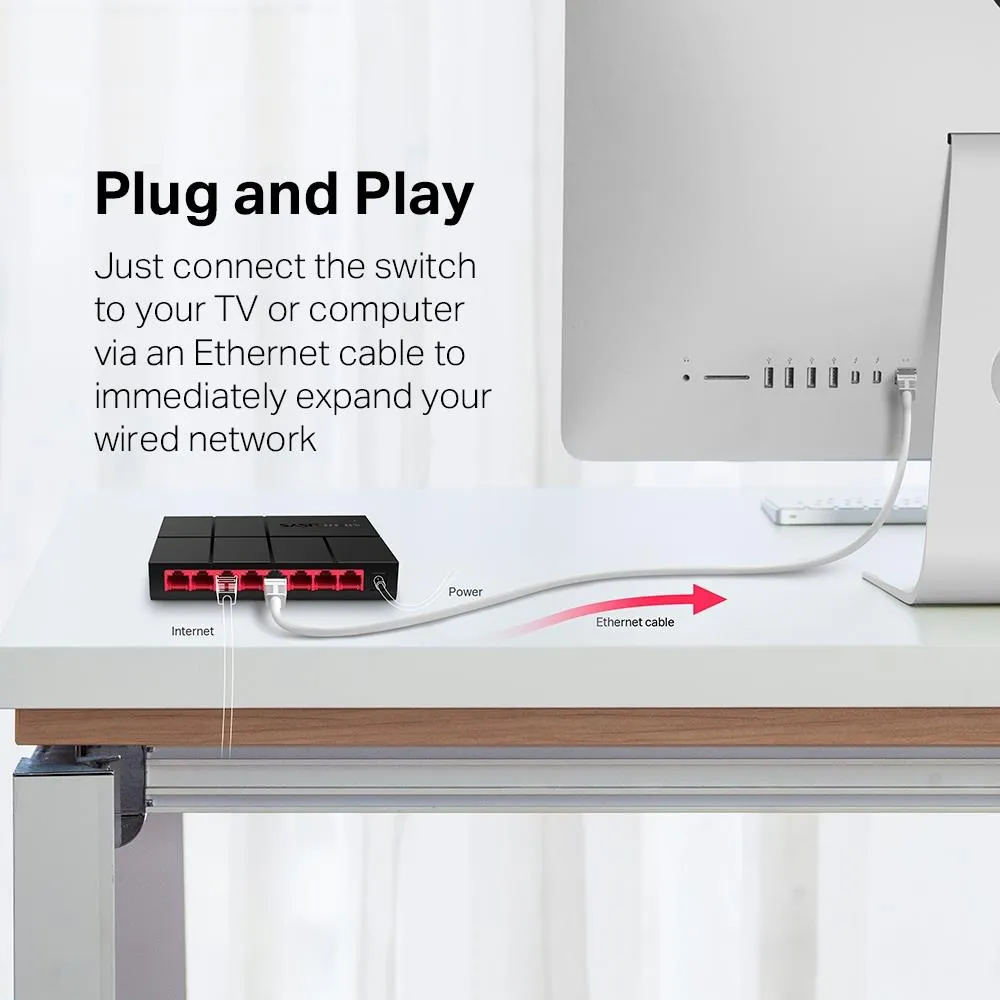 Forget about complicated installation. Just connect the switch to your TV or computer via an Ethernet cable to immediately expand your wired network. Absolutely no configuration is required.