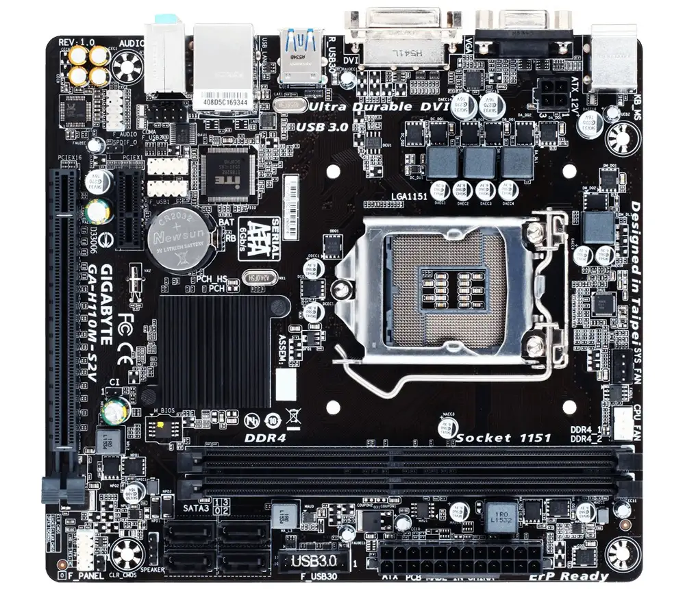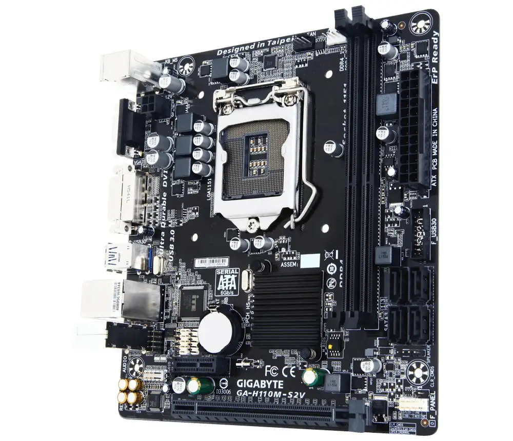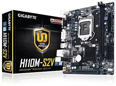Gigabyte GA-H110M-S2V. Protsessori tootja: Intel, Protsessori pesa: LGA 1151 (pesa H4), Ühilduvad protsessoriseeriad: Intel® Celeron®, Intel® Pentium®. Toetatud mälutüübid: DDR4-SDRAM, Mälupesa tüüp: DIMM, Toetatud mälu taktsagedused: 2133 MHz. Kõvaketta ühenduse tüüp: Jada ATA III. Ethernet-liidese tüüp: Gigabit Ethernet. Komponent: PC, Emaplaadi kujutegur: Mikro ATX, Emaplaadi kiibistik: Intel