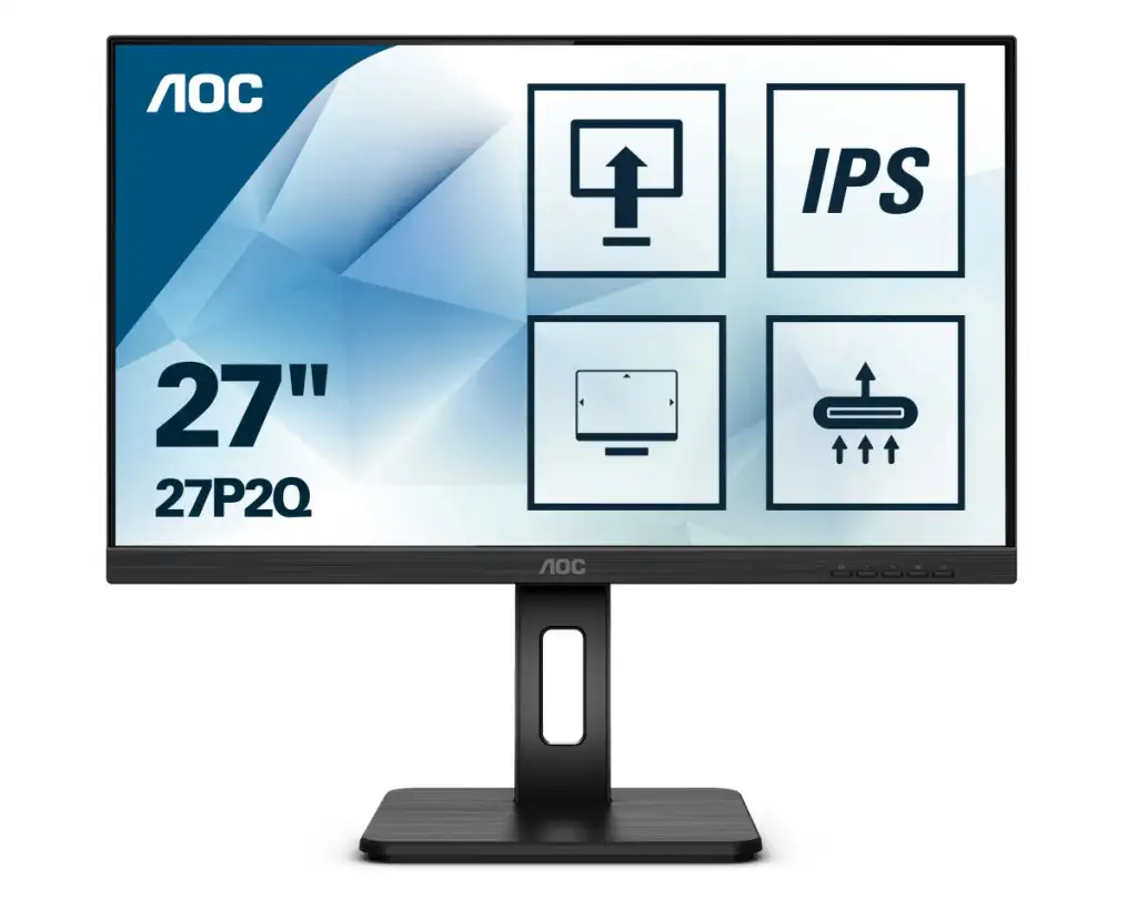 AOC P2 27P2Q. Ekraani diagonaal: 68,6 cm (27"), Ekraani resolutsioon: 1920 x 1080 pikslit, HD tüüp: Full HD, Ekraani tehnoloogia: LED, Ekraani pind: Matt, Reaktsiooniaeg: 4 ms, Loomulik kuvasuhe: 16:9, Vaatenurk, horisontaalne: 178°, Vaatenurk, vertikaalne: 178°. Sisseehitatud kõlar(id). Sisseehitatud USB-jaotur, USB-jaoturi versioon: 3.2 Gen 1 (3.1 Gen 1). VESA paigaldamine, Kõrguse reguleerimine. Toote värv: Must