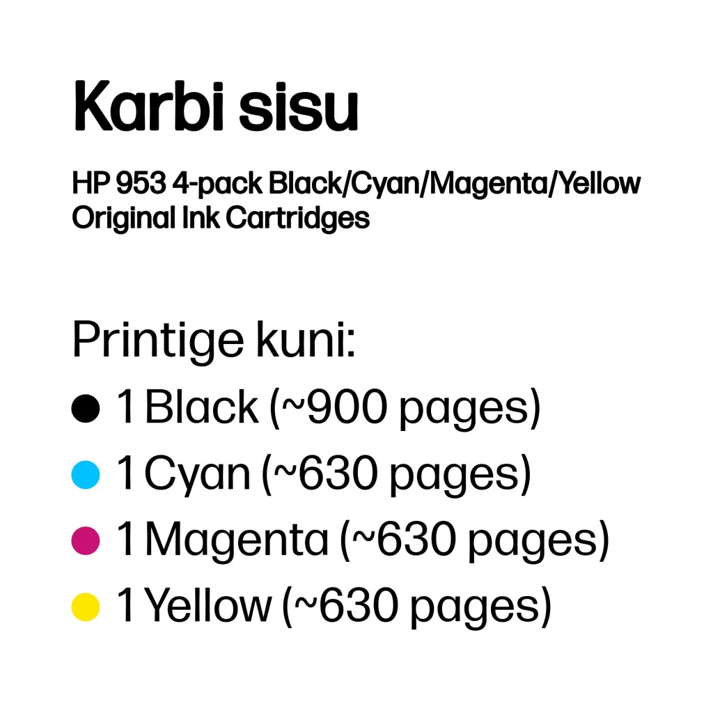 HP 953 4-pack Black/Cyan/Magenta/Yellow Original Ink Cartridges. Värvilise trüki lehekülgede arv: 630 lehekülge, Printimisvärvid: Must, Tsüaan, Magenta, Kollane, Kogus pakis: 4 tk, Musta tindi lehekülgede piirarv: 900 lehekülge