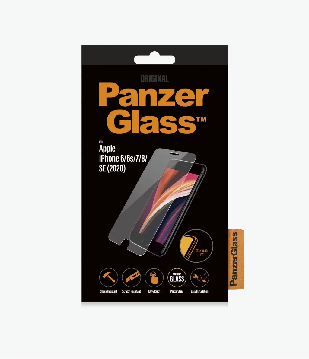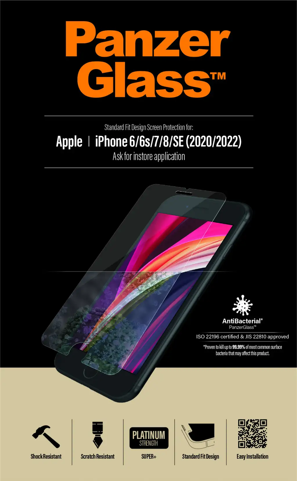 PanzerGlass ® Screen Protector iPhone 8 | 7 | 6s | 6 | SE (2020/2022) | Standard Fit. Brändiühilduvus: Apple, Ühilduvus: Apple - iPhone 6, Apple - iPhone 6s, Apple - iPhone 7, Apple - iPhone 8, Apple - iPhone SE 2020,.... Kuiv pealekandmine. Kaitseomadused: Kriimukindel, Löögikindel, Antibakteriaalne. Materjal: Karastatud klaas, Polüetüleentereftalaat (PET), Silikoon, Toote värv: Läbipaistev. Kogus pakis: 1 tk