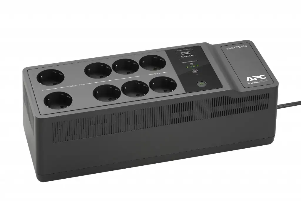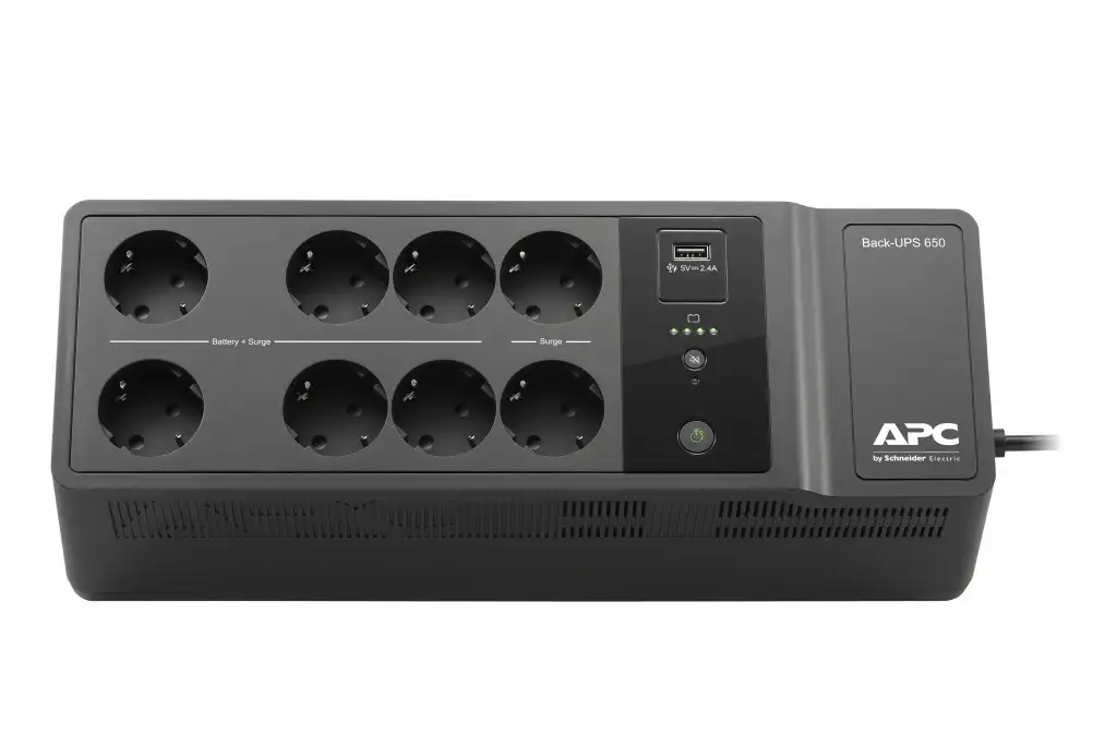 APC Back-UPS 650VA 230V 1 USB charging port - (Offline-) USV. Puhvertoiteallika topoloogia: Ooteseisund (võrgust väljas), Väljundvõimsuse potentsiaal: 0,65 kVA, Väljundvõimsus: 400 W. AC-väljundi tüüp: Tüüp F, Elektripistik: Tüüp F, AC-väljundite arv: 8 vahelduvvoolu kontakt. Toote kuju: Kompaktne, Toote värv: Must. Jätkusuutlikkuse sertifikaadid: Green Premium