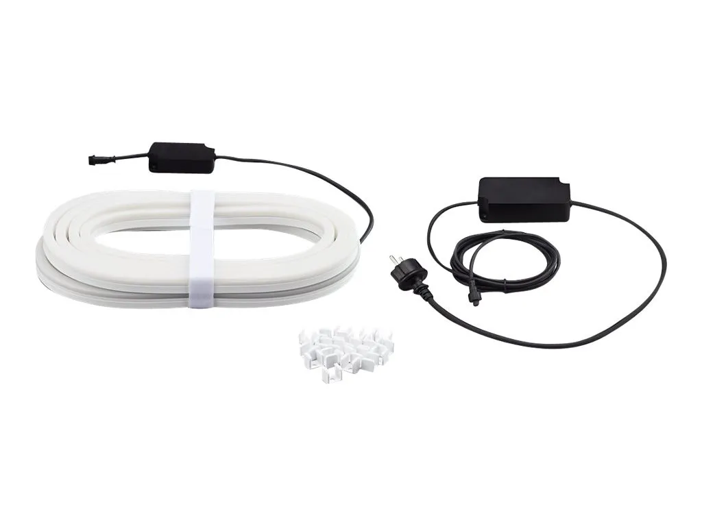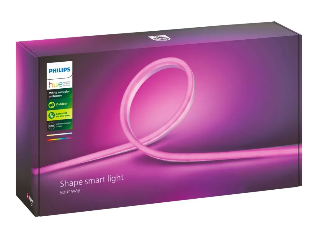 Philips Hue White and colour ambience 5-meetrine õuevalgusti Lightstrip. Tüüp: Nutikas valgusriba, Liides: ZigBee, Toote värv: Valge. Toetatud mobiilsed operatsioonisüsteemid: Android, iOS. Energiatõhususe klass: G, Energiakulu 1000 tunni kohta: 38 kWh, Võimsustarve (ooterežiim): 0,5 W. Laius: 11 mm, Sügavus: 4870 mm, Kõrgus: 20 mm. Pakendi tüüp: Karp, Pakendi laius: 38,2 mm, Pakendi sügavus: 9,6 mm
