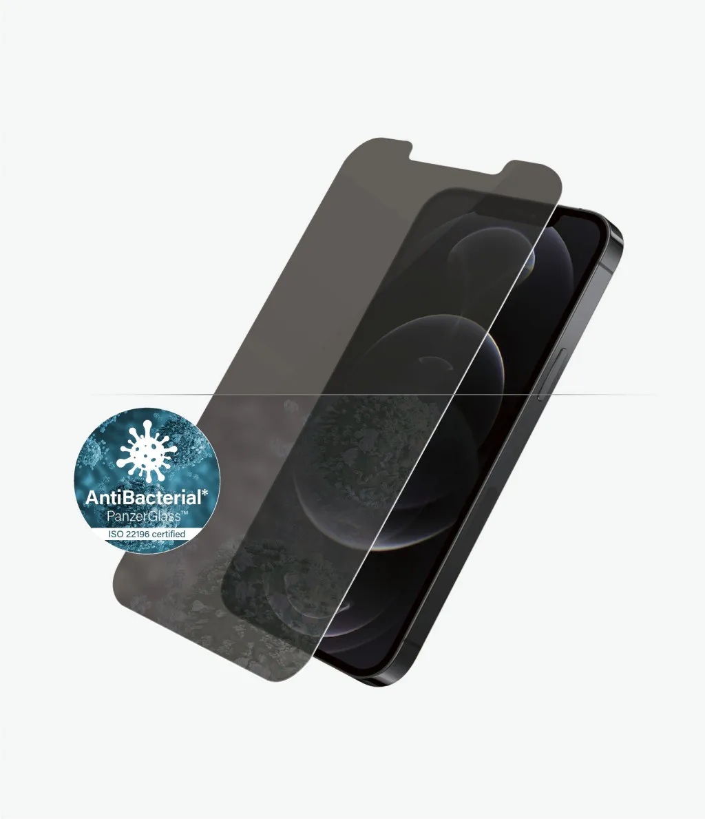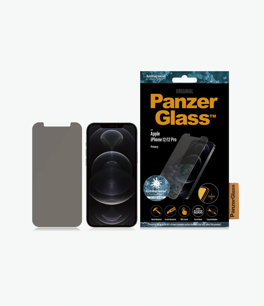 PanzerGlass ® Privacy Screen Protector iPhone 12 | 12 Pro | Standard Fit. Brändiühilduvus: Apple, Ühilduvus: Apple - iPhone 12, Apple - iPhone 12 Pro. Kuiv pealekandmine. Kaitseomadused: Kriimukindel, Löögikindel, Antibakteriaalne. Privaatsusfiltri funktsioon, Materjal: Karastatud klaas, Polüetüleentereftalaat (PET), Silikoon, Toote värv: Läbipaistev. Kogus pakis: 1 tk