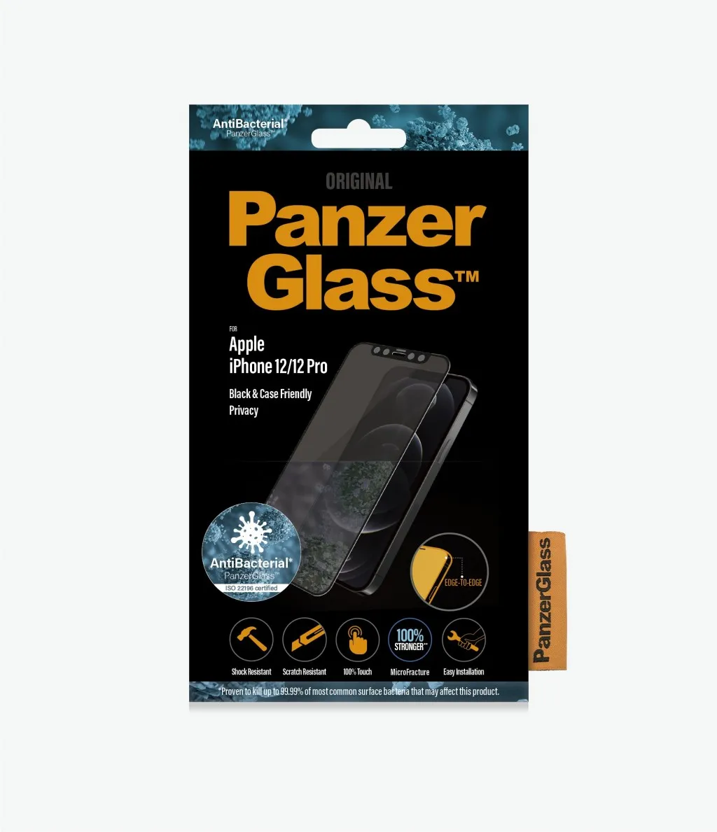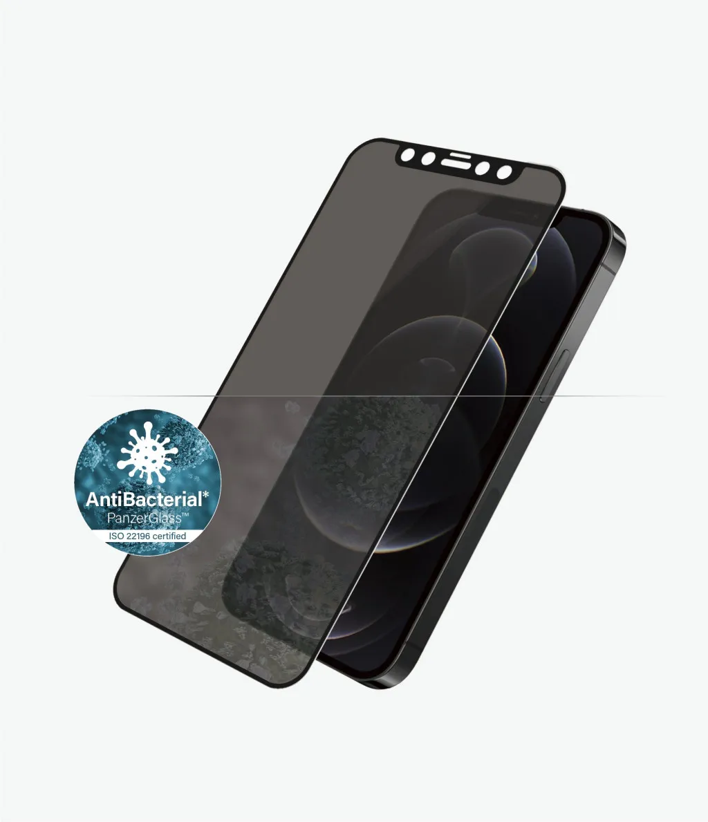 PanzerGlass ® Privacy Screen Protector iPhone 12 | 12 Pro | Edge-to-Edge. Brändiühilduvus: Apple, Ühilduvus: Apple - iPhone 12, Apple - iPhone 12 Pro. Kuiv pealekandmine. Kaitseomadused: Kriimukindel, Löögikindel, Antibakteriaalne. Privaatsusfiltri funktsioon, Materjal: Karastatud klaas, Polüetüleentereftalaat (PET), Silikoon, Toote värv: Läbipaistev. Kogus pakis: 1 tk