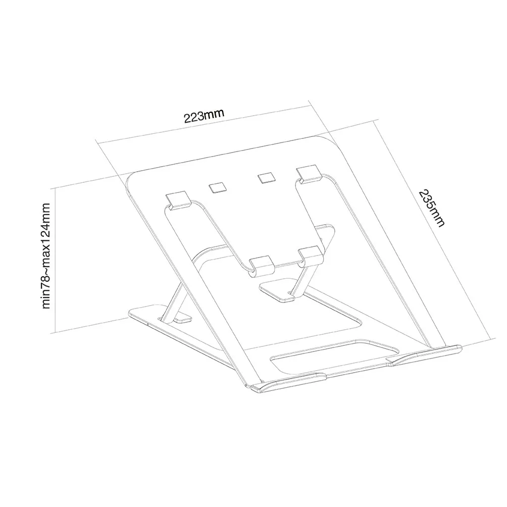 Neomounts NSLS085GREY. Toote tüüp: Sülearvuti alus, Toote värv: Hall, Materjal: Alumiinium. Kõrguse reguleerimise ulatus: 78 - 124 mm, Laiuse reguleerimise ulatus: 0 - 223 mm, Sühavuse reguleerimisvahemik: 0 - 235 mm. Laius: 223 mm, Sügavus: 235 mm, Kõrgus: 124 mm. Pakendi laius: 240 mm, Pakendi sügavus: 30 mm, Pakendi kõrgus: 240 mm. Põhikasti (välimise) laius: 365 mm, Põhikasti (välimine) pikkus: 250 mm, Põhikasti (välimise) kõrgus: 544 mm