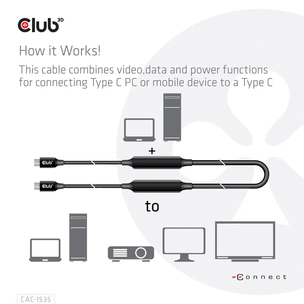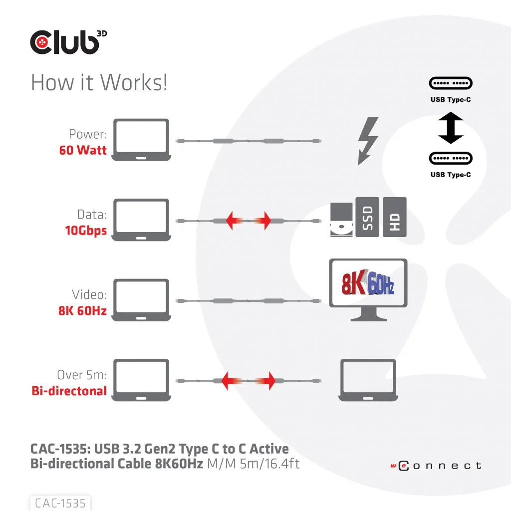 CLUB3D CAC-1535. Kaabli pikkus: 5 m. Pistmik 1: USB C, Pistmik 2: USB C, USB versioon: USB 3.2 Gen 2 (3.1 Gen 2), Maksimaalne andmeedastuskiirus: 10 Gbit/s, Toote värv: Must