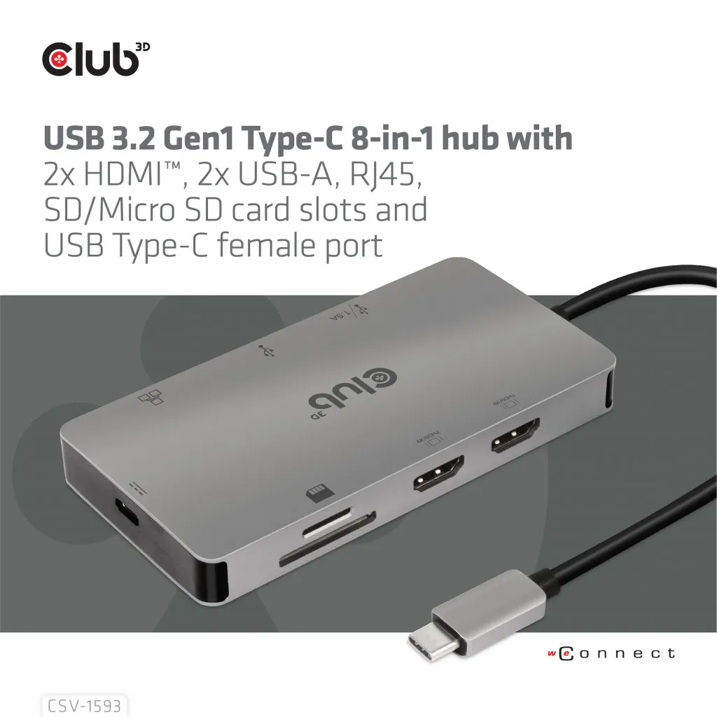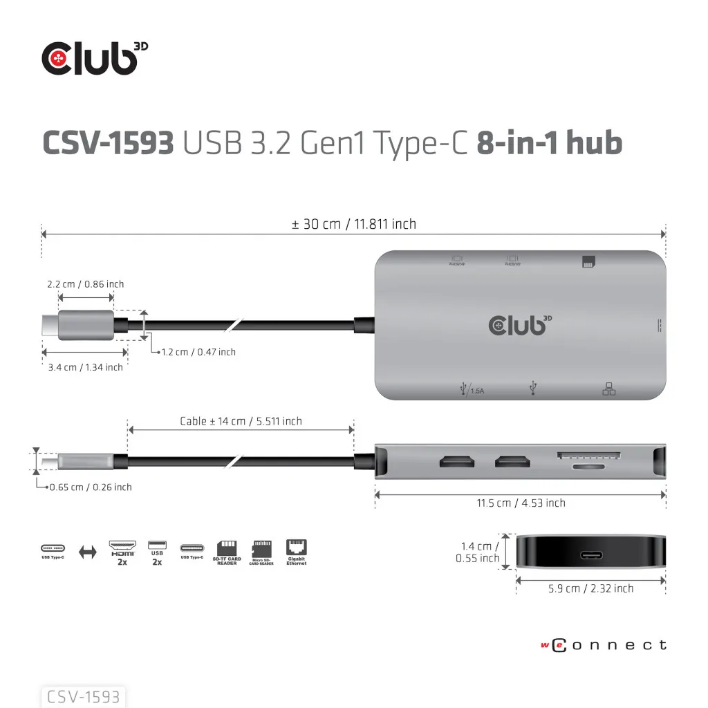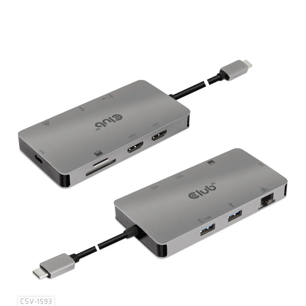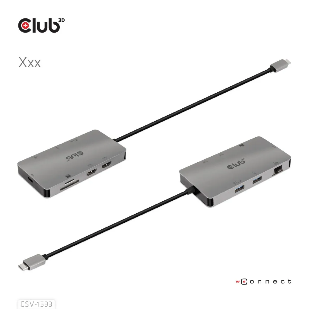CLUB3D CSV-1593. Hostiliides: USB 3.2 Gen 1 (3.1 Gen 1) Type-C, Jaoturi liidesed: HDMI, USB 3.2 Gen 1 (3.1 Gen 1) Type-A, USB 3.2 Gen 2 (3.1 Gen 2) Type-C. Andmeedastuskiirus: 16200 Mbit/s, Maksimaalne resolutsioon (HDMI): 3840 x 2160 pikslit, Toote värv: Metallik. Ethernet-liidese tüüp: Gigabit Ethernet