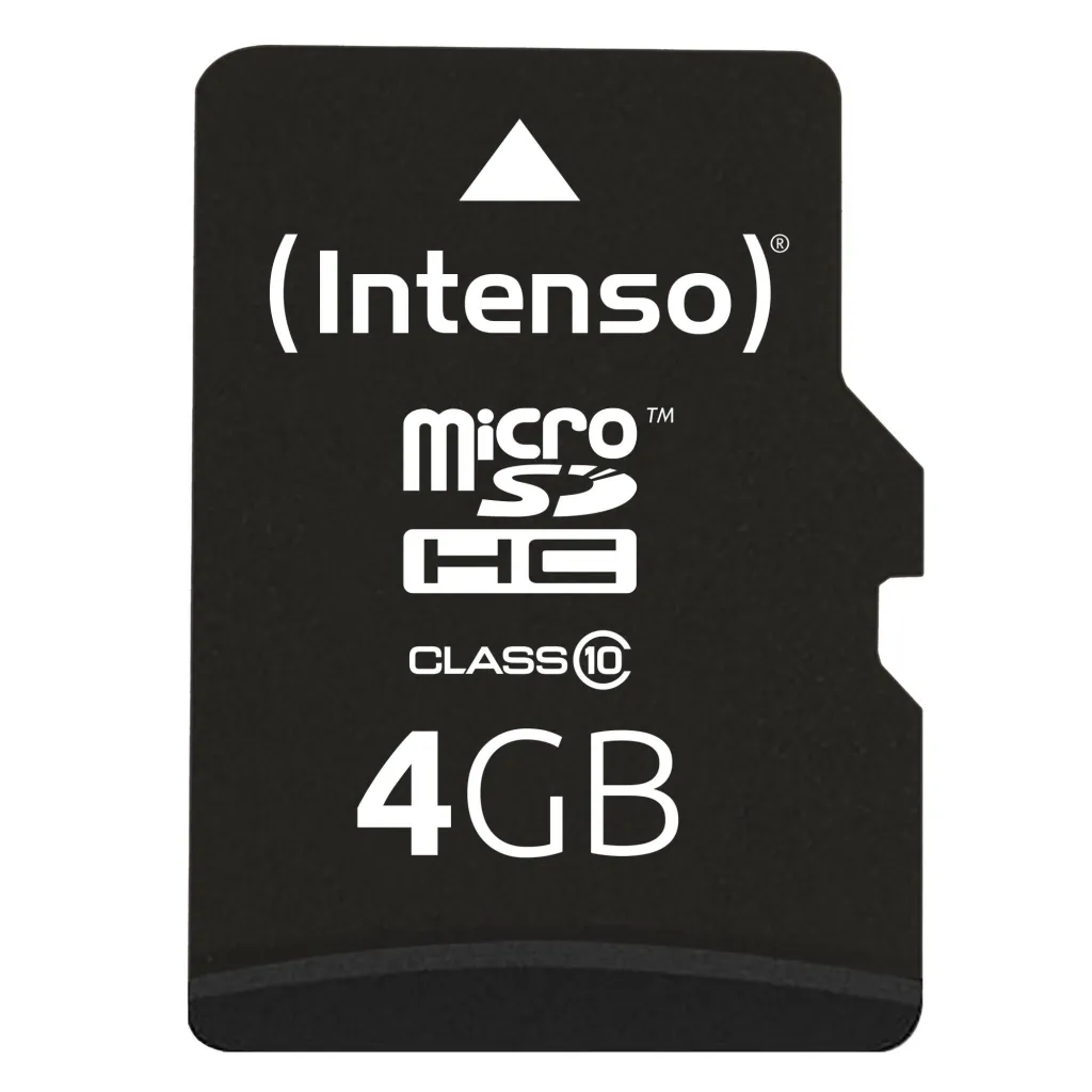 | Summary | Intenso 4GB MicroSDHC. Capacity: 4 GB, Flash card type: MicroSDHC, Flash memory class: Class 10, Read speed: 25 MB/s. Protection features: Shock resistant, Temperature proof, Waterproof, X-ray proof, Product colour: Black |