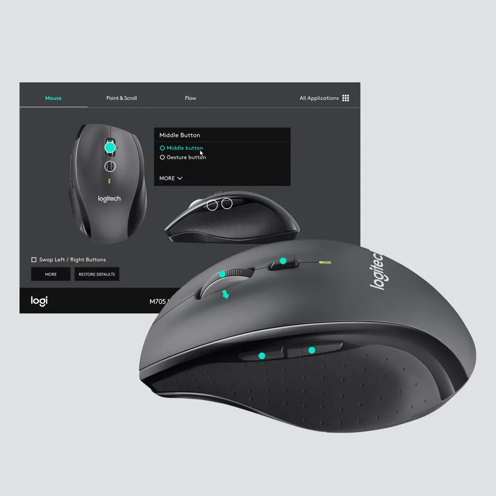 Logitech Customizable Mouse M705. Toote kuju: Parempoolne. Liikumistuvastuse tehnoloogia: Optiline, Seadme liides: Raadioside, Liikumise resolutsioon: 1000 DPI, Klahvide tüüp: Sissevajutatavad nupud, Nuppude arv: 5, Skrolli tüüp: Ratas. Toiteallikas: Patareid. Toote värv: Süsi