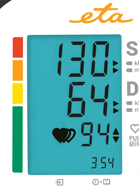 Suitable for home use. Measurement of systolic and diastolic pressure, pulse. Oscillometric measurement method. Display of measured values on LCD. Fully automatic filling and deflation of the cuff. Pressure measurement accuracy +/- 3 mmHg, pulse +/- 5%. Pressure measurement range 0 - 299 mmHg, pulse 40 - 199 per minute. Irregular heart rate detection. WHO blood pressure classification.