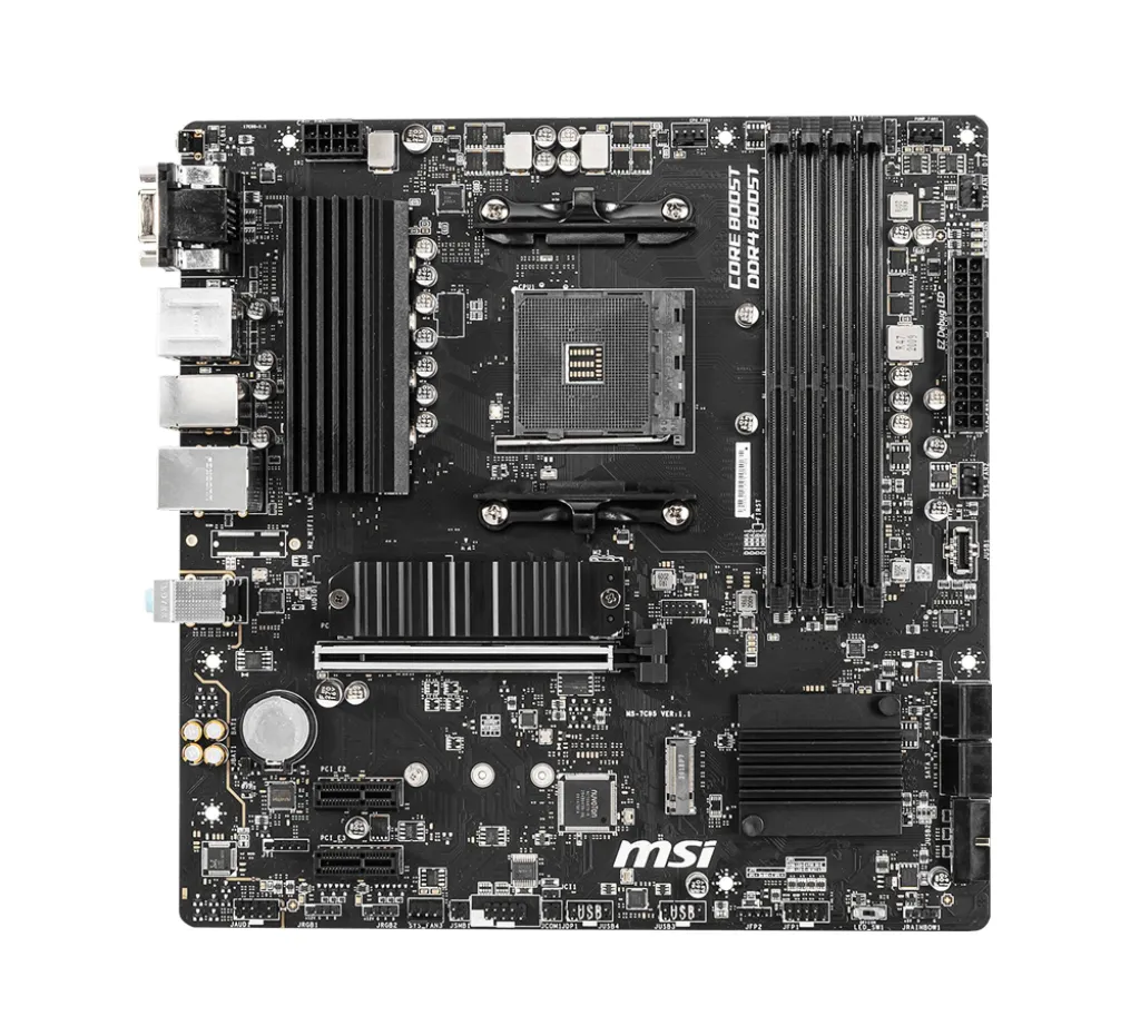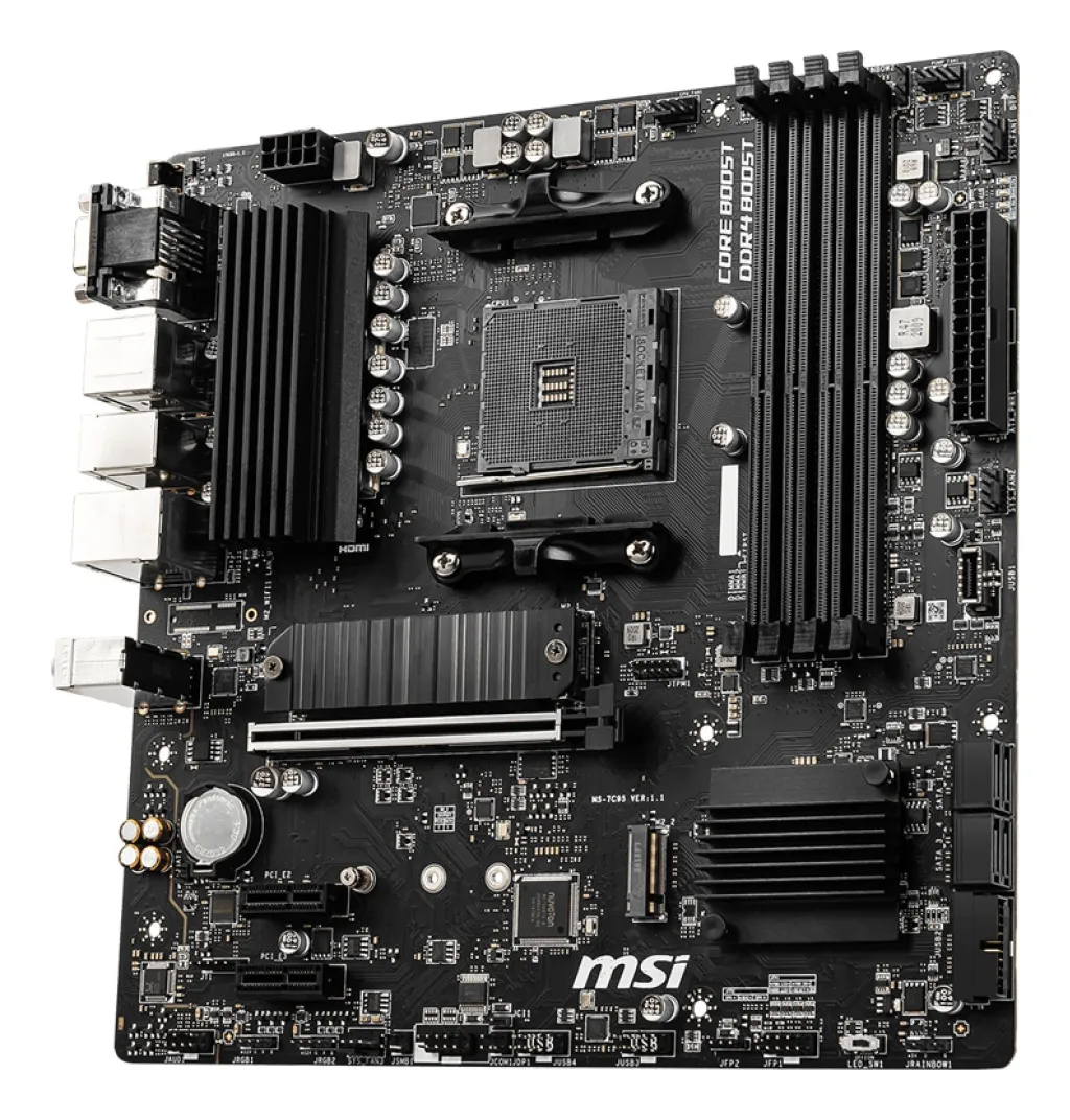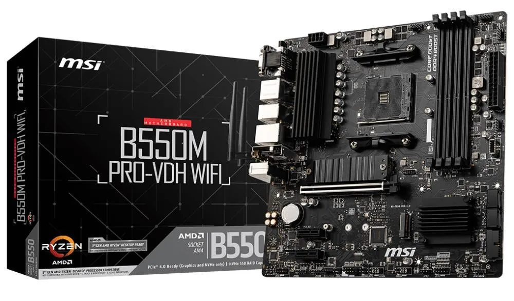 | Summary | MSI B550M PRO-VDH. Processor manufacturer: AMD, Processor socket: Socket AM4, Compatible processor series: AMD Ryzen 3000 Series. Supported memory types: DDR4-SDRAM, Maximum internal memory: 128 GB, Memory slots type: DIMM. Supported storage drive interfaces: SATA III, Supported storage drive types: HDD & SSD, RAID levels: 0, 1, 10. Maximum resolution: 4096 x 2160 pixels. Ethernet interface type: Gigabit Ethernet, LAN controller: Realtek 8111HN |