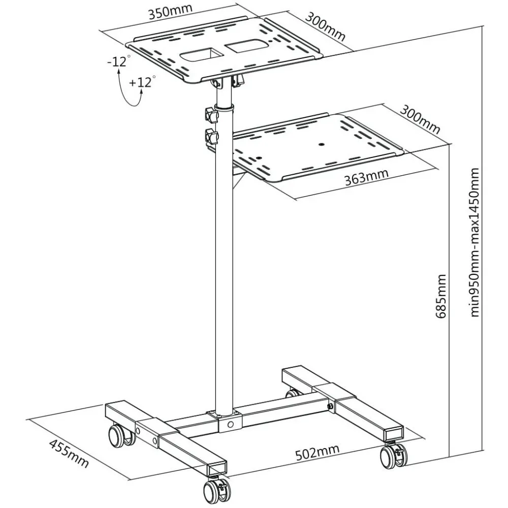 Techly ICA-TB TPM-10. Toote värv: Must, Materjal: Plast, Teras, Maksimaalne kaal (mahutavus): 10 kg. Kõrguse reguleerimise ulatus: 950 - 1450 mm, Kaldenurk: -12 - 12°. Laius: 363 mm, Sügavus: 300 mm, Kõrgus: 1450 mm. Tooteid põhikasti (välimine) kohta: 1 tk, Kogus pakis: 1 tk