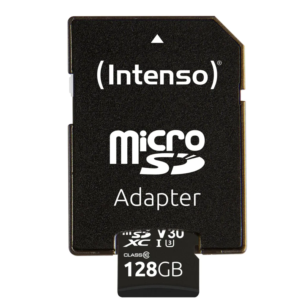 | Summary | Intenso microSDXC 128GB Class 10 UHS-I Professional - Extended Capacity SD (MicroSDHC). Capacity: 128 GB, Flash card type: MicroSDXC, Flash memory class: Class 10, Internal memory type: UHS-I, Read speed: 100 MB/s, Write speed: 45 MB/s, UHS Speed Class: Class 3 (U3), Video Speed Class: V30. Protection features: Shock resistant, Temperature proof, Waterproof, X-ray proof, Product colour: Black |