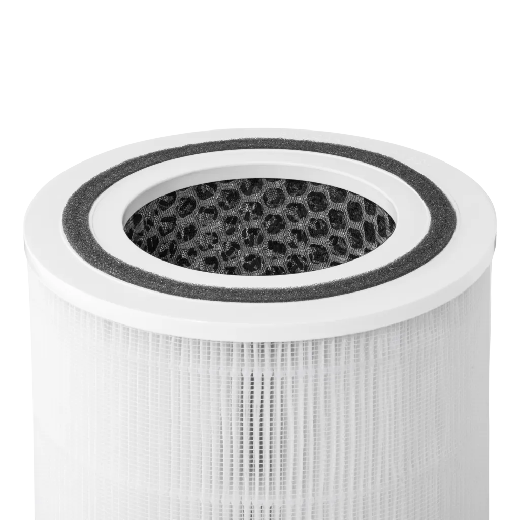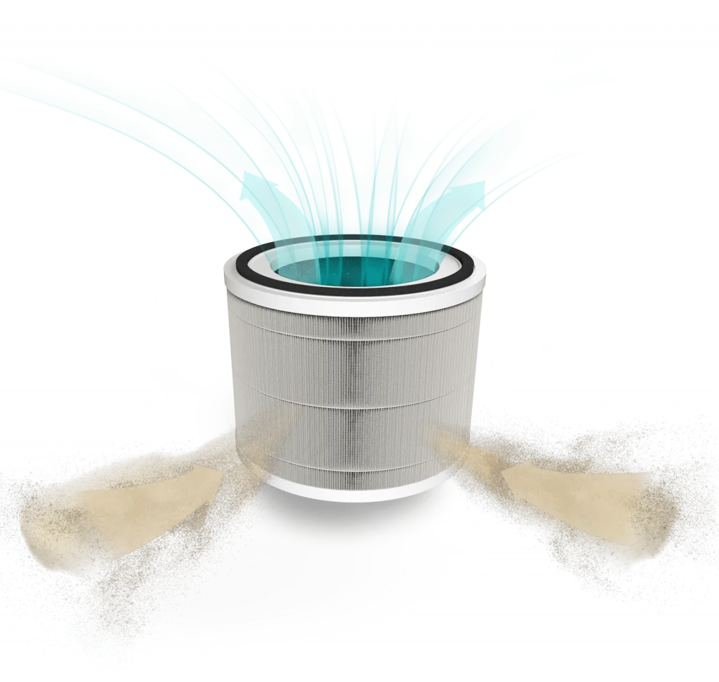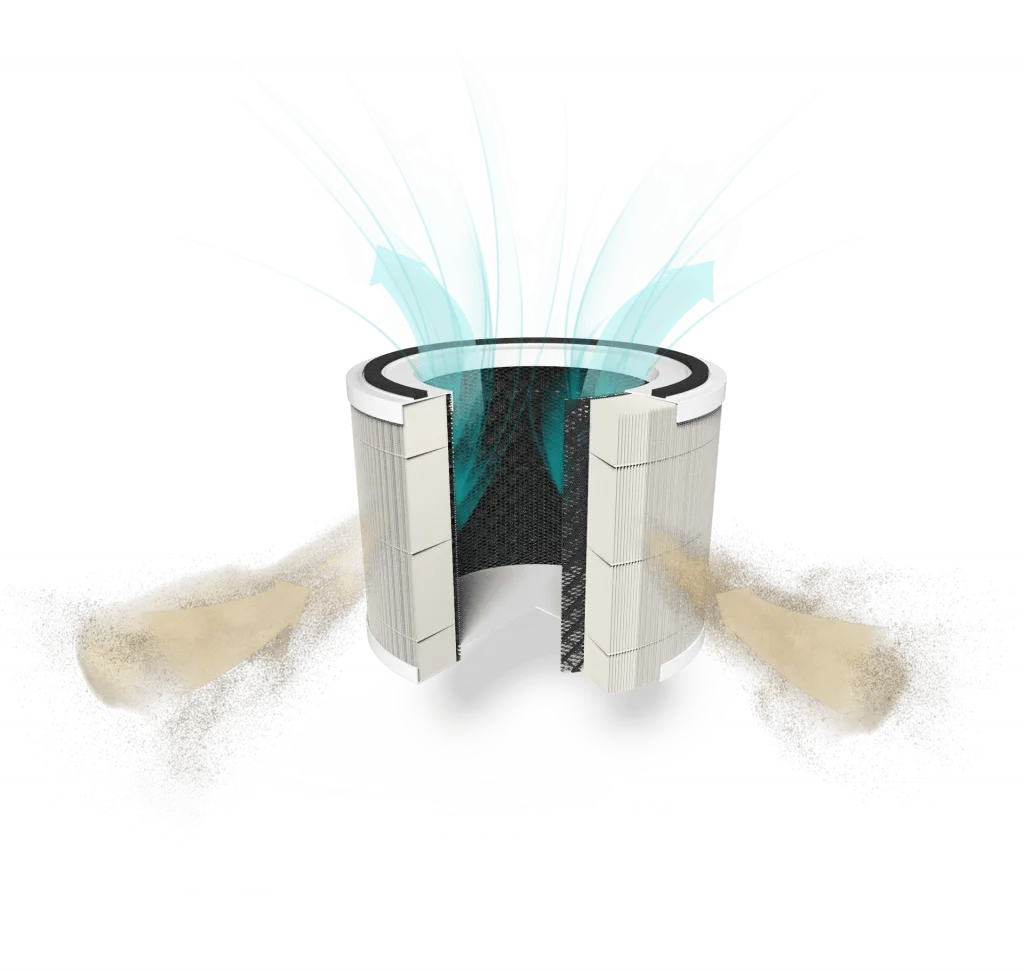 HEPA+Activated carbon. 99,97% removal efficiency. Removes dust particles, odours and other dangerous substances from the air, such as fine dust (PM2.5, PM0.3, PM0.1), smog, pollen, cigarette smoke, viruses, bacteria, benzene and formaldehyde.