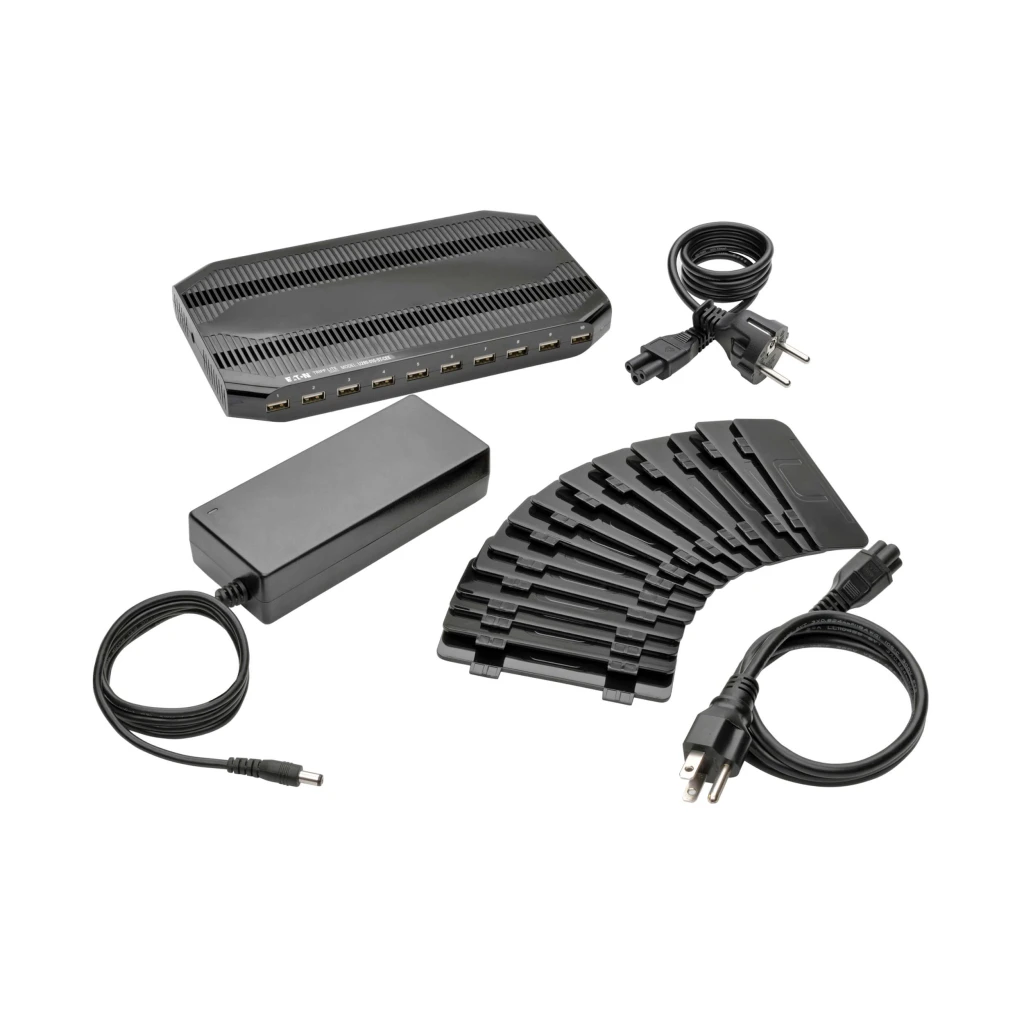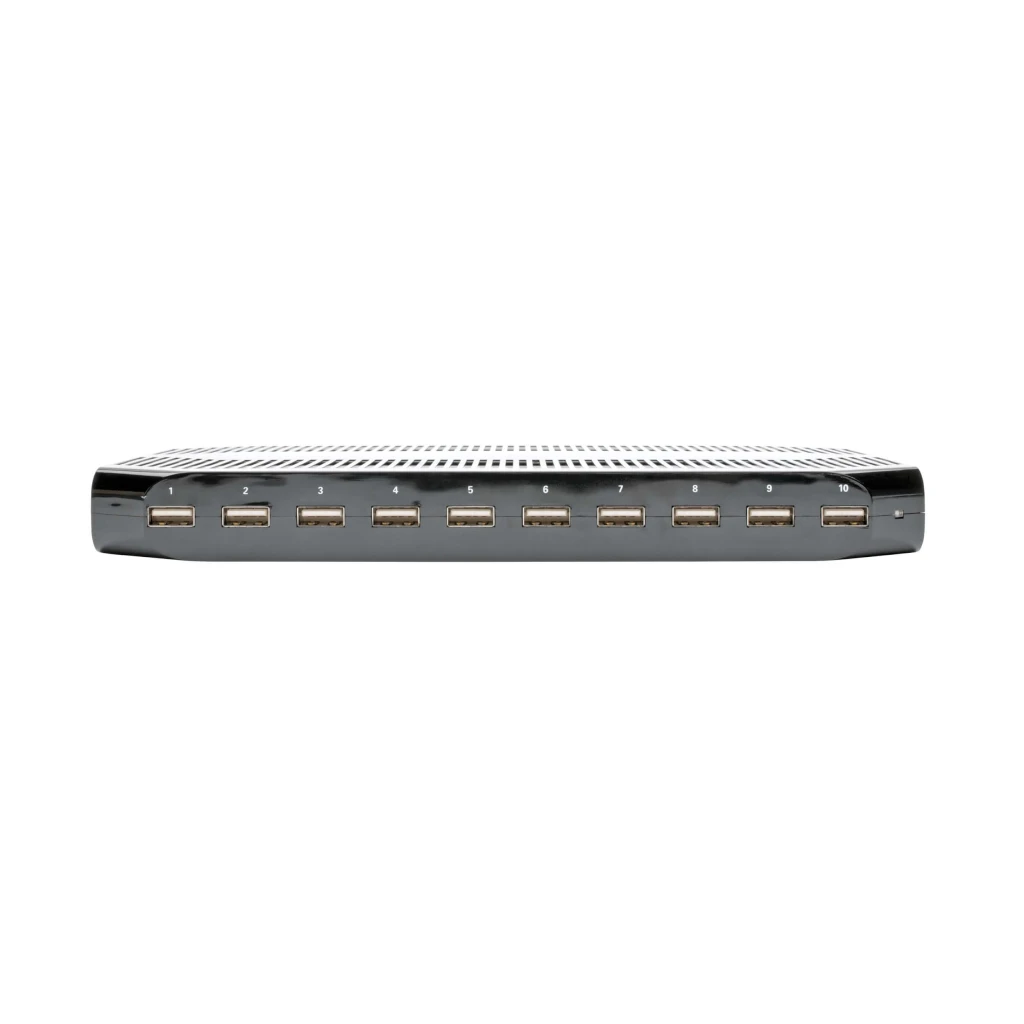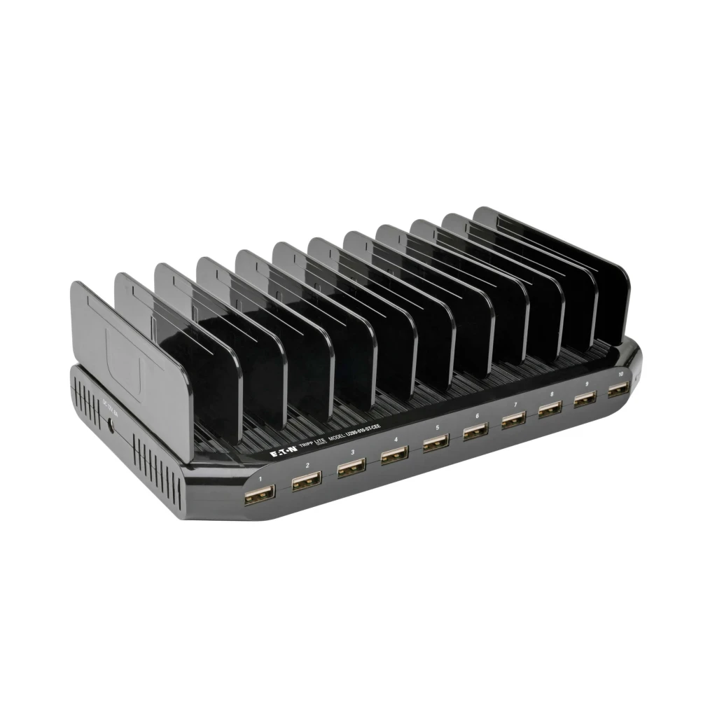 Up to 5V 2.4A per port for charging battery-intensive devices; All ten ports support USB Battery Charging (BC) specification v1.2; External dual-voltage power supply with Schuko plug; Protects against overheating, overcurrent and overcharging; Includes 14 adjustable storage brackets for organizing devices; Charges anywhere AC power is available—no computer required (for 120V applications please use Tripp Lite's P013-Series cables, not included)