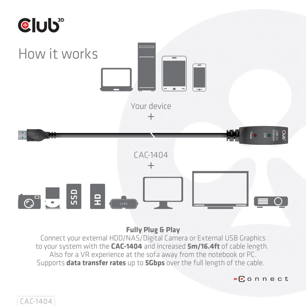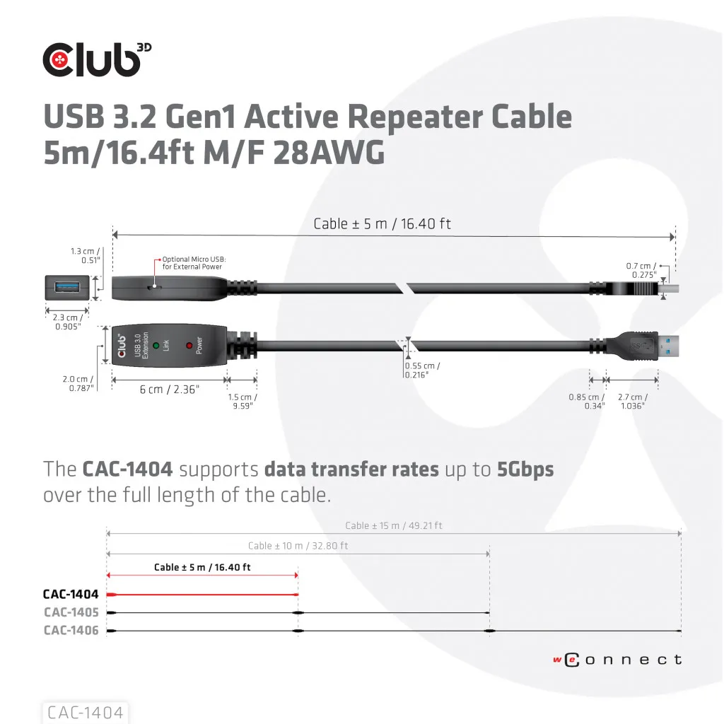 CLUB3D CAC-1404. Kaabli pikkus: 5 m. Pistmik 1: USB A, Pistmik 2: USB A, USB versioon: USB 3.2 Gen 1 (3.1 Gen 1), Toote värv: Must