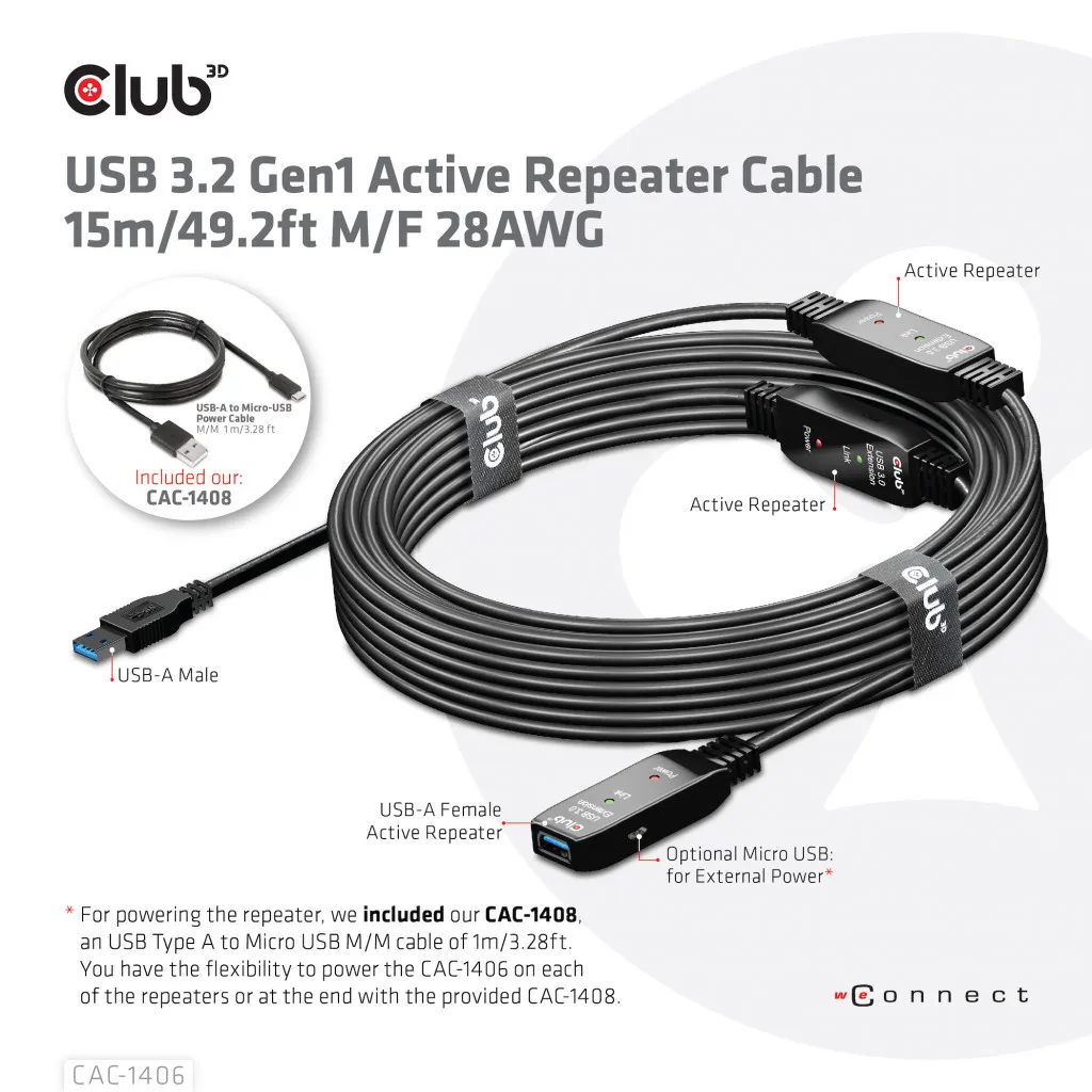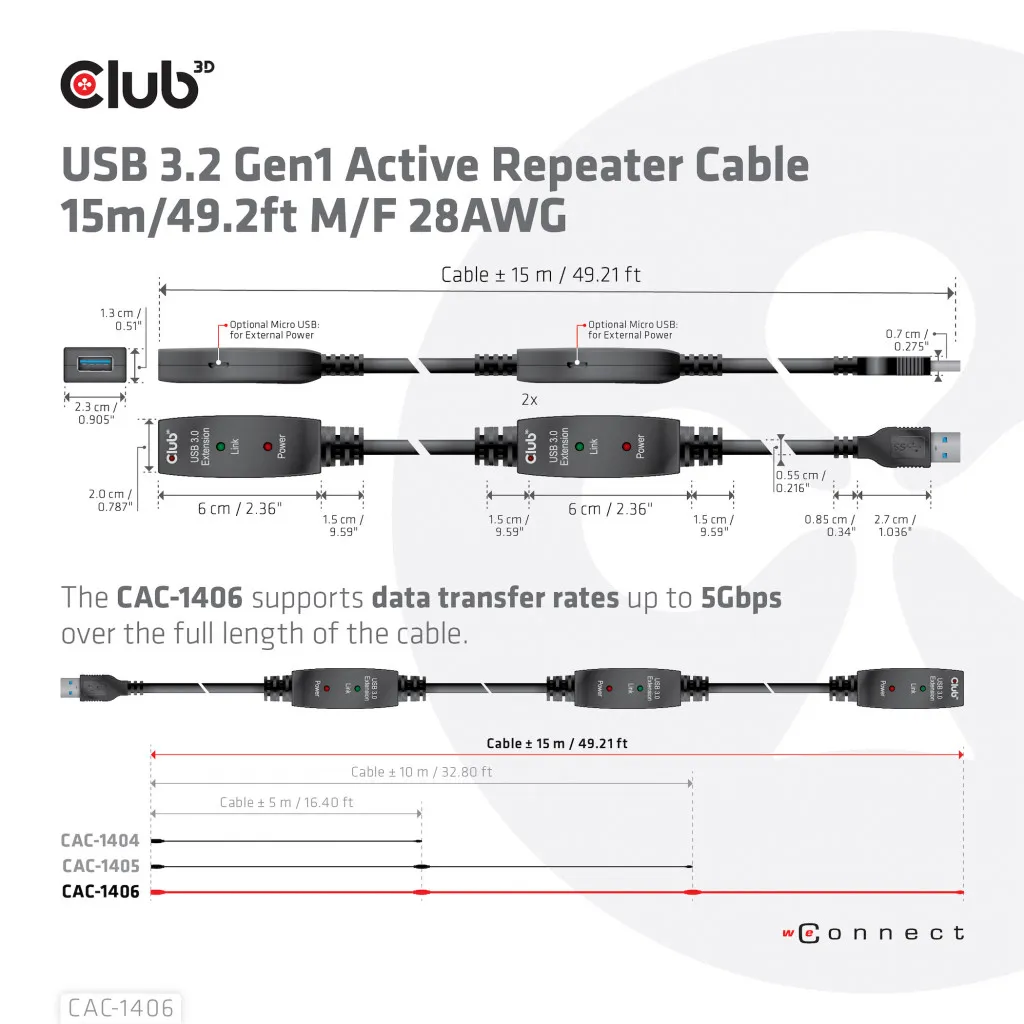 CLUB3D CAC-1406. Kaabli pikkus: 15 m. Pistmik 1: USB A, Pistmik 2: USB A, USB versioon: USB 3.2 Gen 1 (3.1 Gen 1), Toote värv: Must
