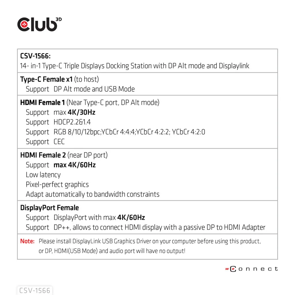CLUB3D CSV-1566. Ühenduvustehnoloogia: Dokkimine, Hostiliides: USB 3.2 Gen 1 (3.1 Gen 1) Type-C. Toote värv: Must, Ühilduvad mälukaardid: MicroSD (TransFlash), SD, Ühilduvus: Lenovo Dell Acer Asus. MSI. Toshiba Apple HP Razer. Toiteallika tüüp: DC (alalisvool). Laius: 304 mm, Sügavus: 77 mm, Kõrgus: 18 mm. Kogus pakis: 1 tk, Pakendi laius: 360 mm, Pakendi sügavus: 115 mm