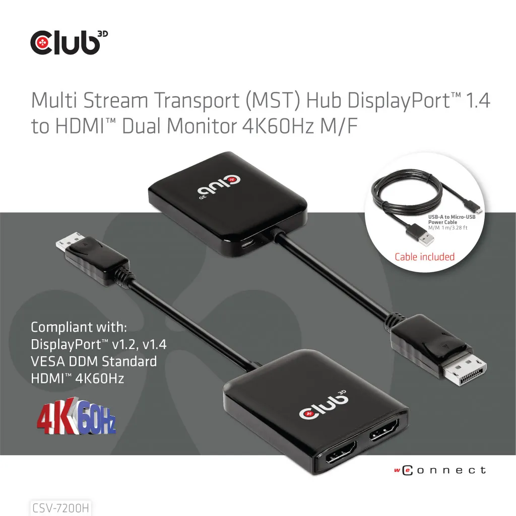 CLUB3D CSV-7200H. Videopordi tüüp: DisplayPort, Videoväljund: 2x HDMI. Sertifikaat: Meets ROHS, FCC, and CE EMI requirements. Päritoluriik: Hiina