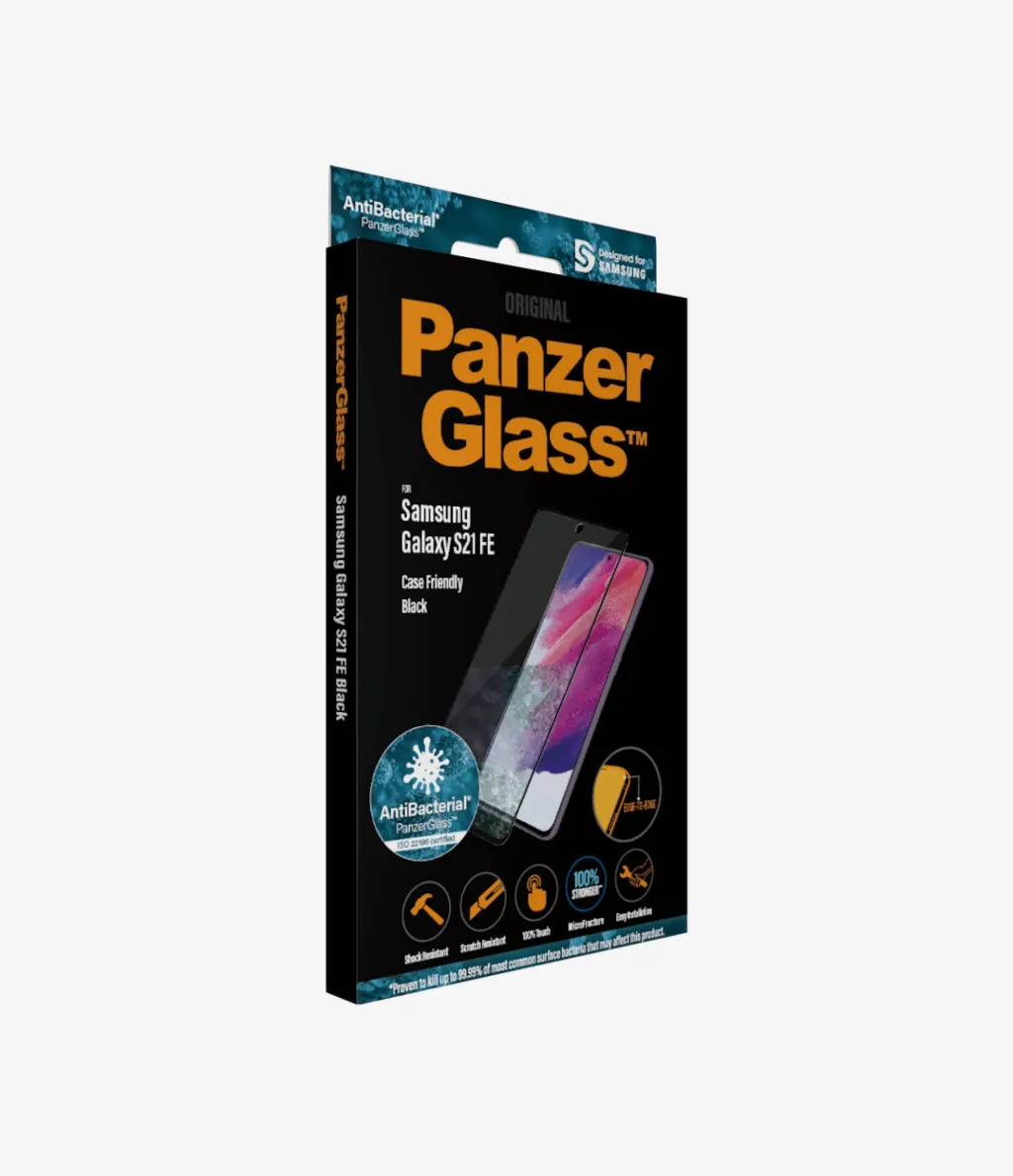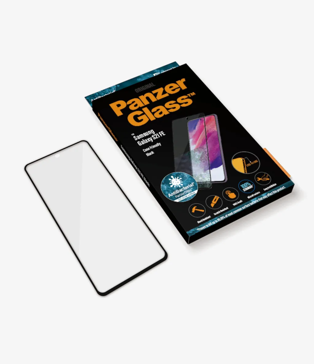 PanzerGlass ® Screen Protector Samsung Galaxy S21 FE. Brändiühilduvus: Samsung, Ühilduvus: Samsung - Galaxy S21 FE. Kuiv pealekandmine. Kaitseomadused: Kriimukindel, Löögikindel, Antibakteriaalne. Materjal: Karastatud klaas, Polüetüleentereftalaat (PET), Silikoon, Toote värv: Läbipaistev. Kogus pakis: 1 tk