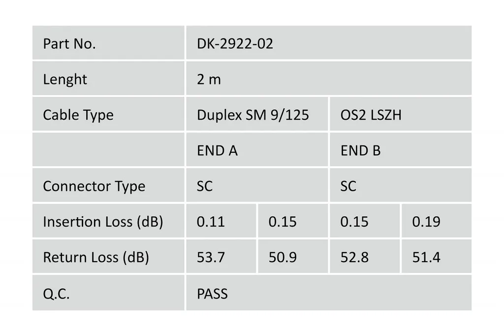 | Muud funktsioonid | Cable diameter 3 mm; Cable type: I-VH 2E9/125µ; Fiber diameter: 09/125µ; Connector 1/2: SC/SC |