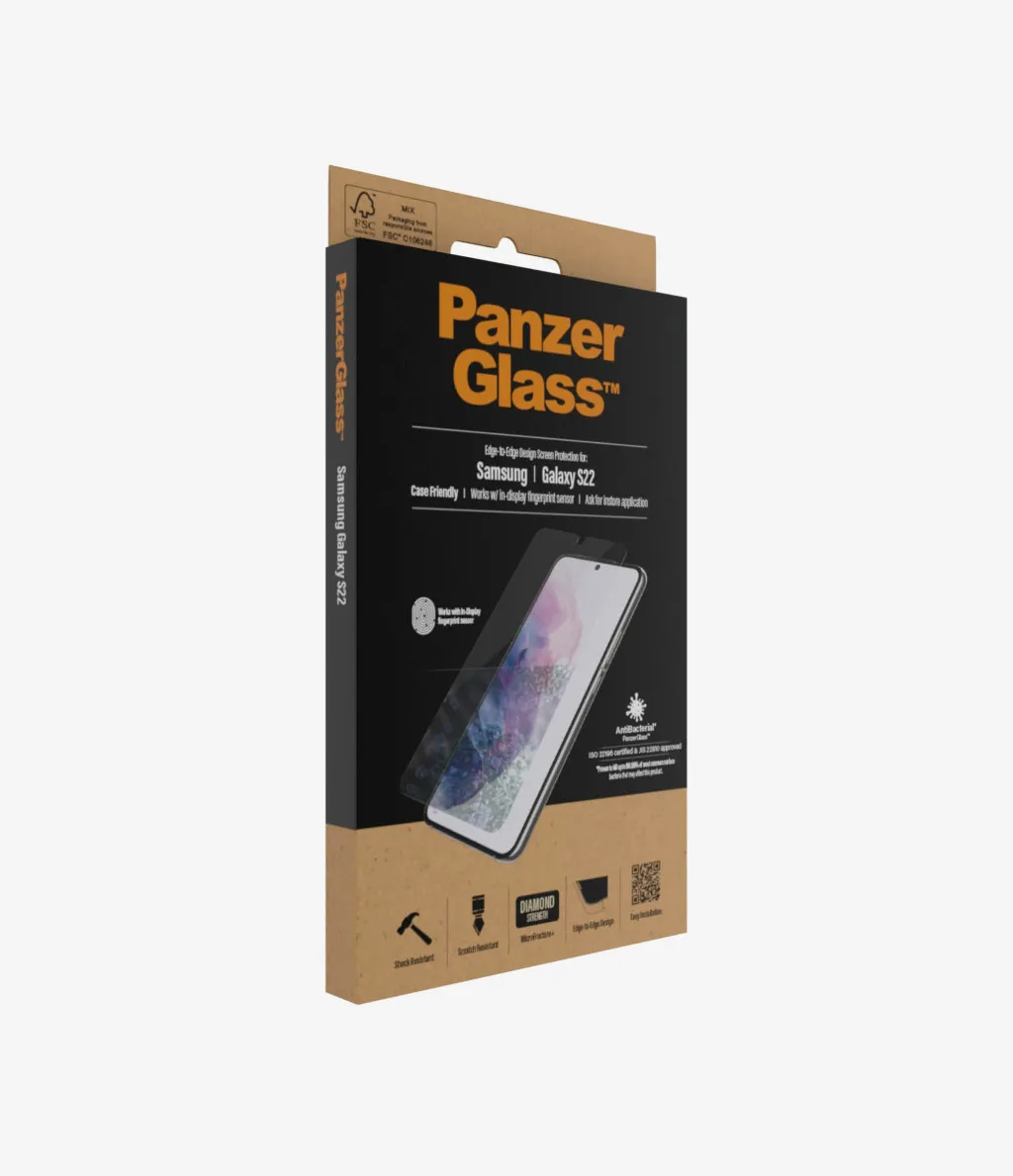 PanzerGlass ® UltraForce1 Samsung Galaxy S22 5G | Screen Protector. Brändiühilduvus: Samsung, Ühilduvus: Samsung - Galaxy S22. Kuiv pealekandmine. Kaitseomadused: Kriimukindel, Löögikindel, Antibakteriaalne. Materjal: Karastatud klaas, Polüetüleentereftalaat (PET), Silikoon, Toote värv: Läbipaistev. Kogus pakis: 1 tk