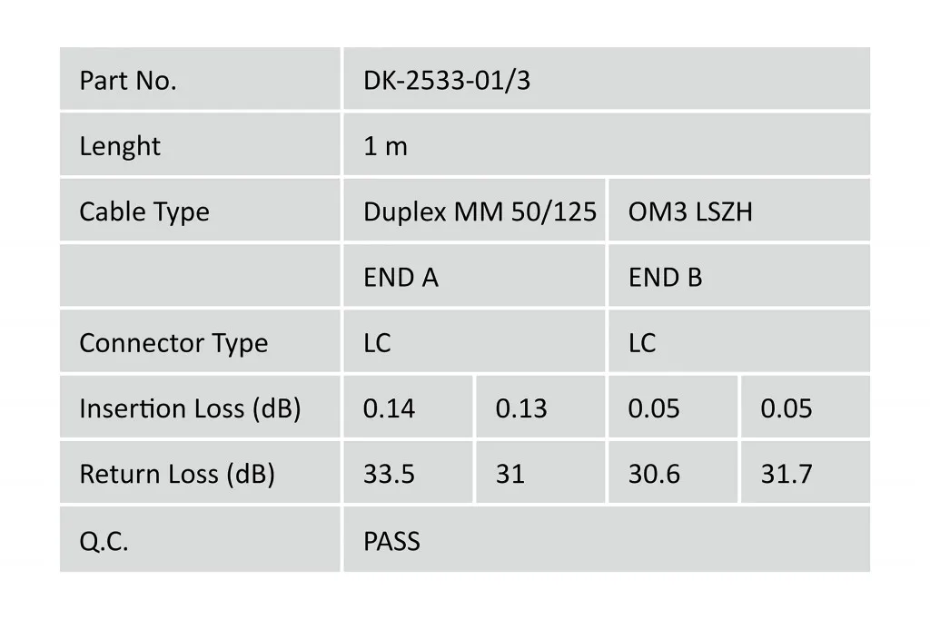 Cable diameter 3 mm; Cable type: I-VH 2G50/125µ; Fiber diameter: 50/125µ; Connector 1/2: LC/LC
