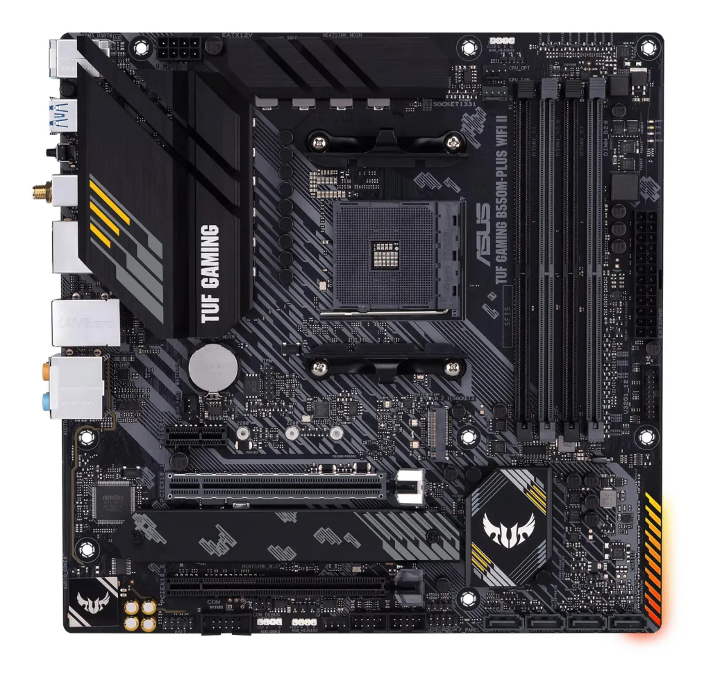TUF Gaming B550M-Plus WIFI II provides a complete, high-performance gaming package with a long list of features to improve your experience, including ultrafast networking for smoother online gameplay, pristine audio with positional cues for FPS gaming, and onboard RGB lighting that syncs with attached accessories to help you create a personalized gaming atmosphere.