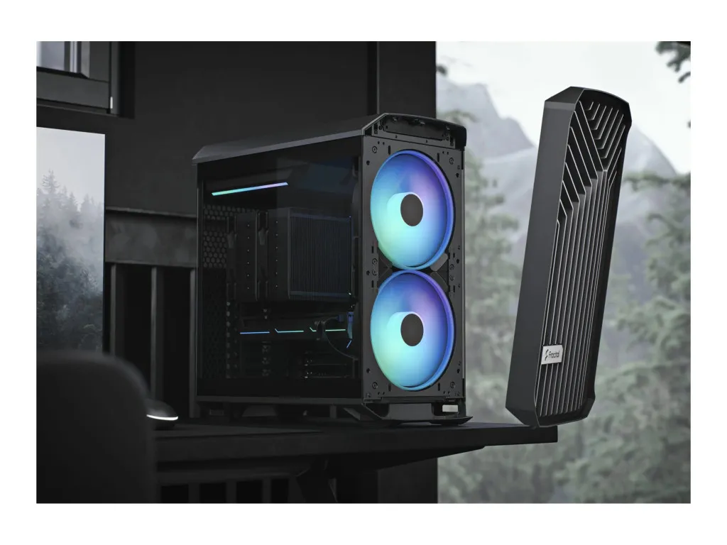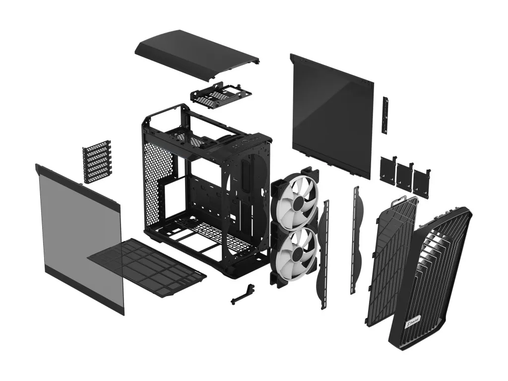 Integrated support for a water-cooling reservoir on the motherboard tray; Top mounted aerodynamic PSU shroud with integrated ARGB effects; Optional front and bottom nylon filters included, allowing the user to prioritize between dust filtering or even higher airflow