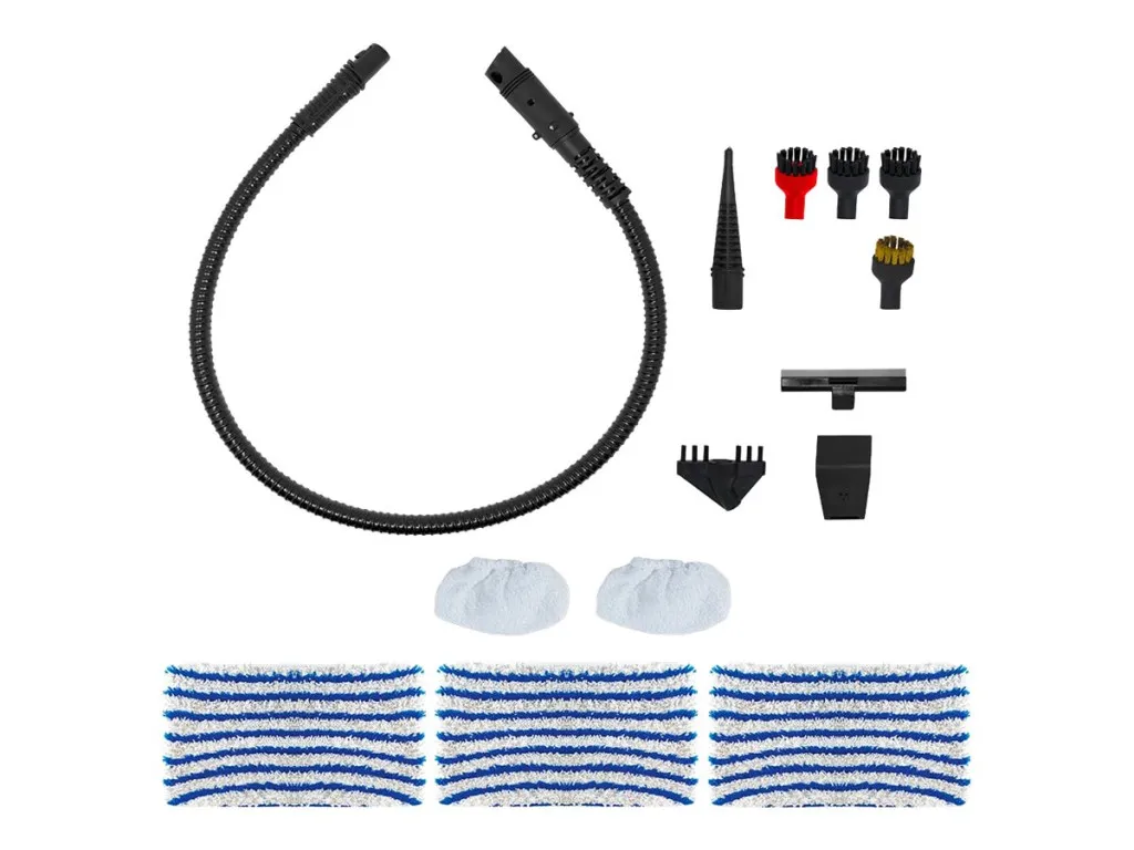 | Tarvikud kaasa arvatud | 3 x Floor cloths; 2x Sockettes; Flexible steam hose; Steam lance; Window cleaner frame; Round brush with brass bristles; 3 x Round brushes with nylon bristles; Grout accessory; Upholstery accessory |